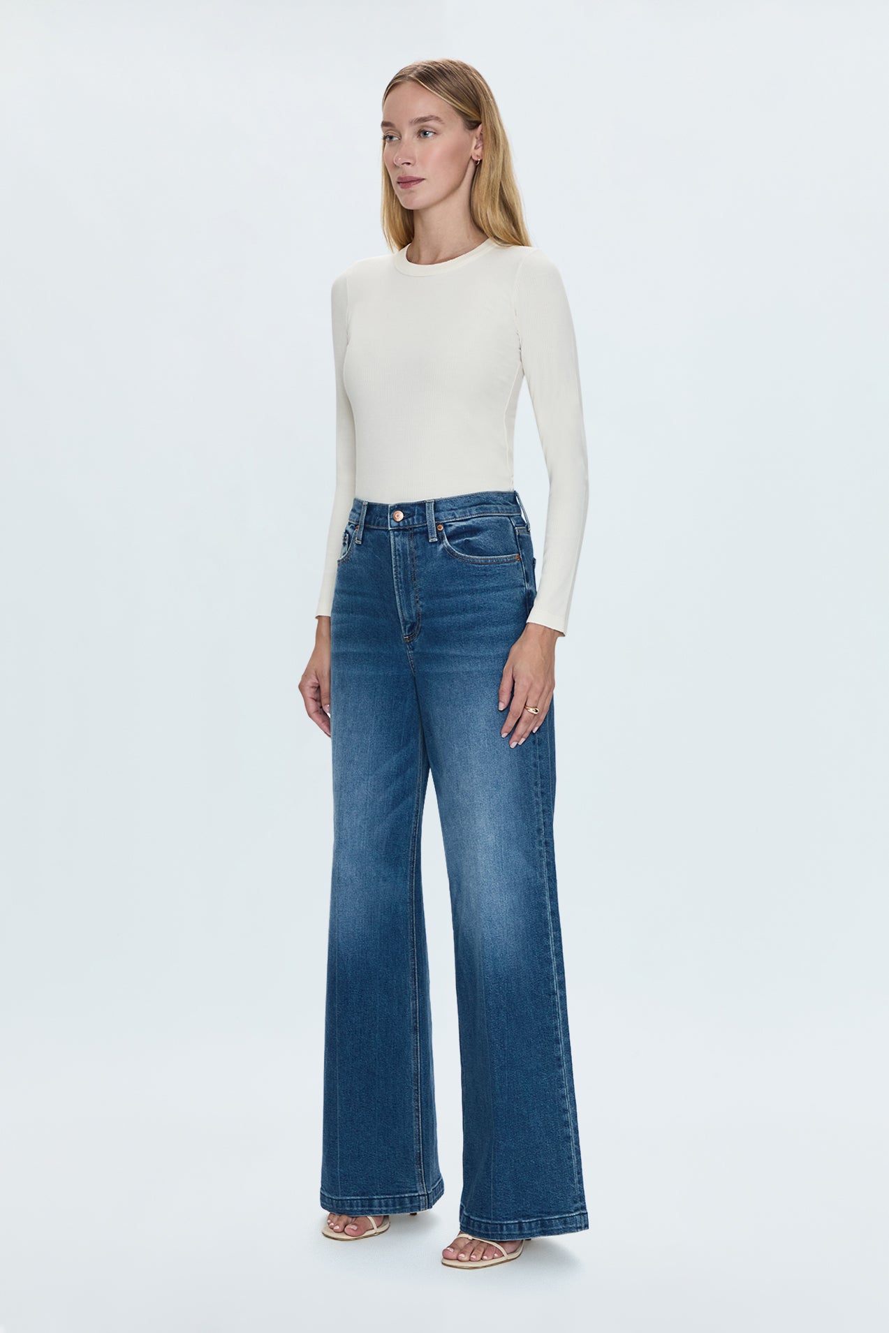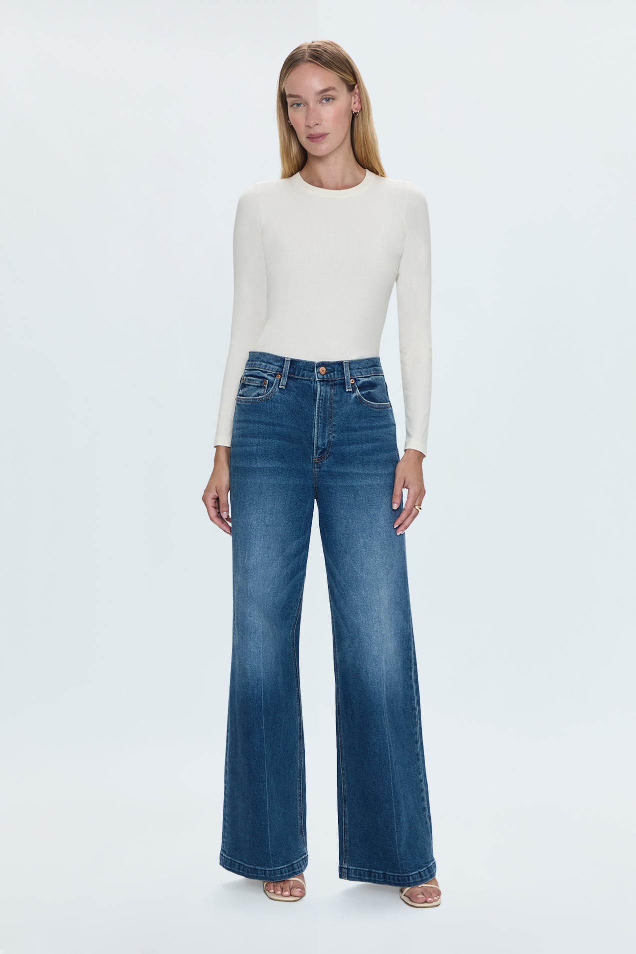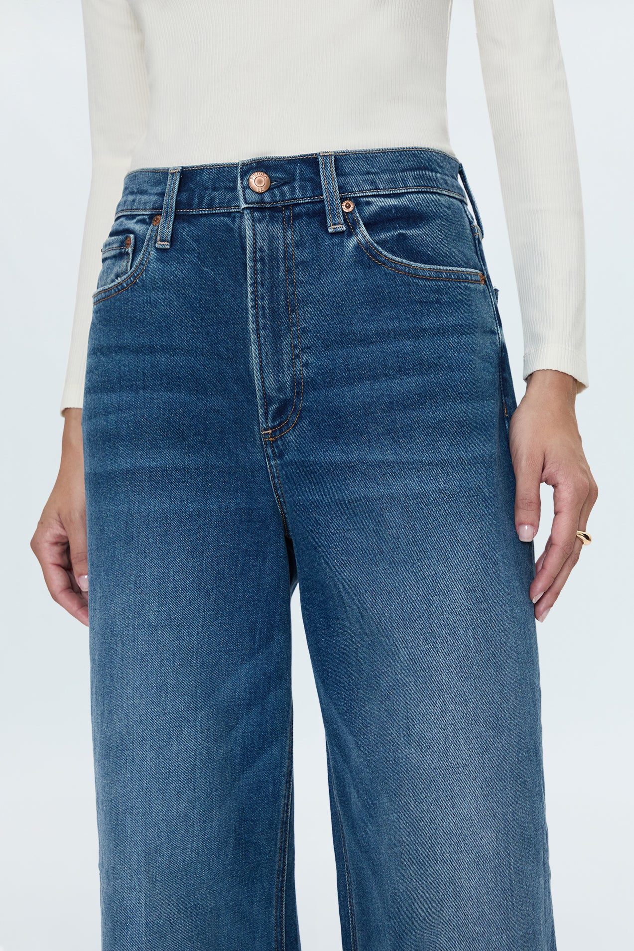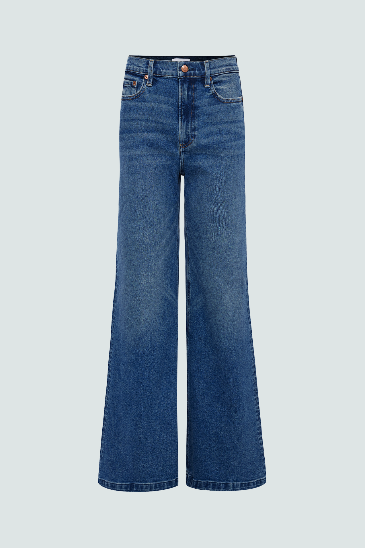 A relaxed, ultra wide leg silhouette with a high rise waist, breezy full length cut, and a clean finish hem. Crafted from our signature comfort stretch denim to provide a structured shape with just the right give. Cider is a medium-dark indigo wash with sophisticated fading and laser whiskering details.