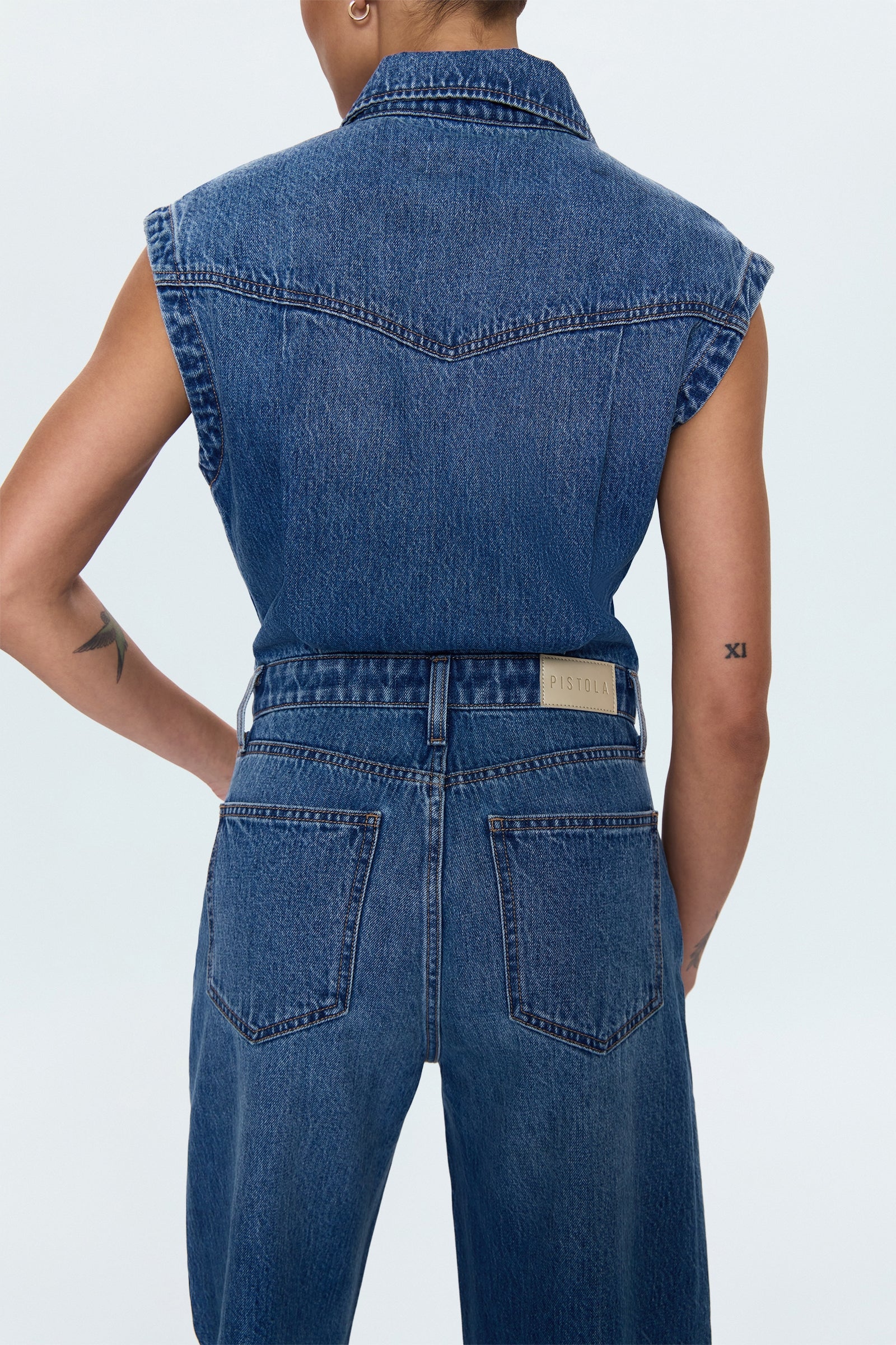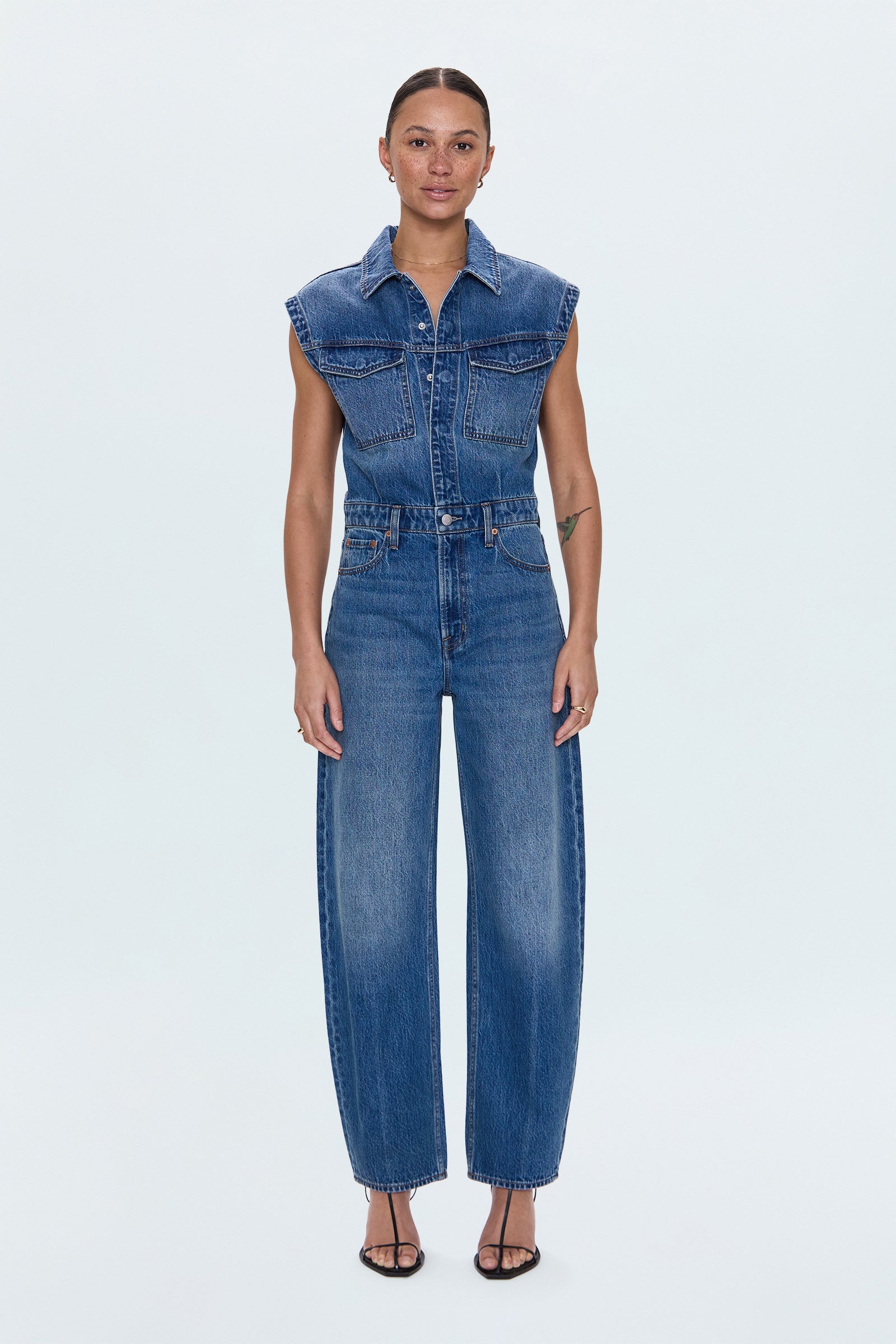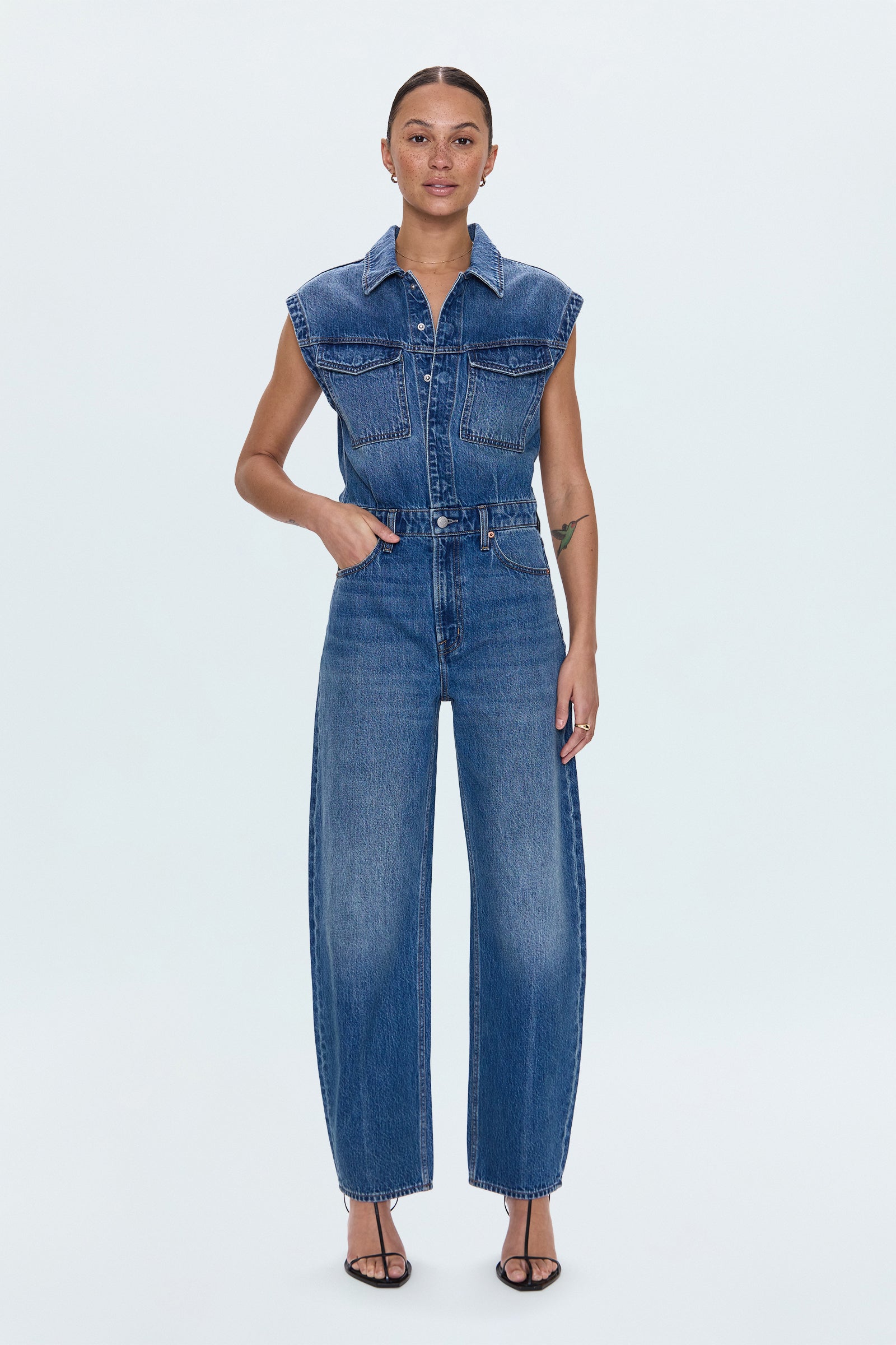 The jumpsuit that does it all. Ace delivers sleeveless sophistication with a barrel leg silhouette and full-length 30" inseam. Its relaxed barrel legs offer modern proportions while the sleeveless design keeps it fresh and contemporary. Crafted from 100% cotton non-stretch fabric in Fairview, a medium blue wash with vintage-inspired highs and lows that feel authentically lived-in.
