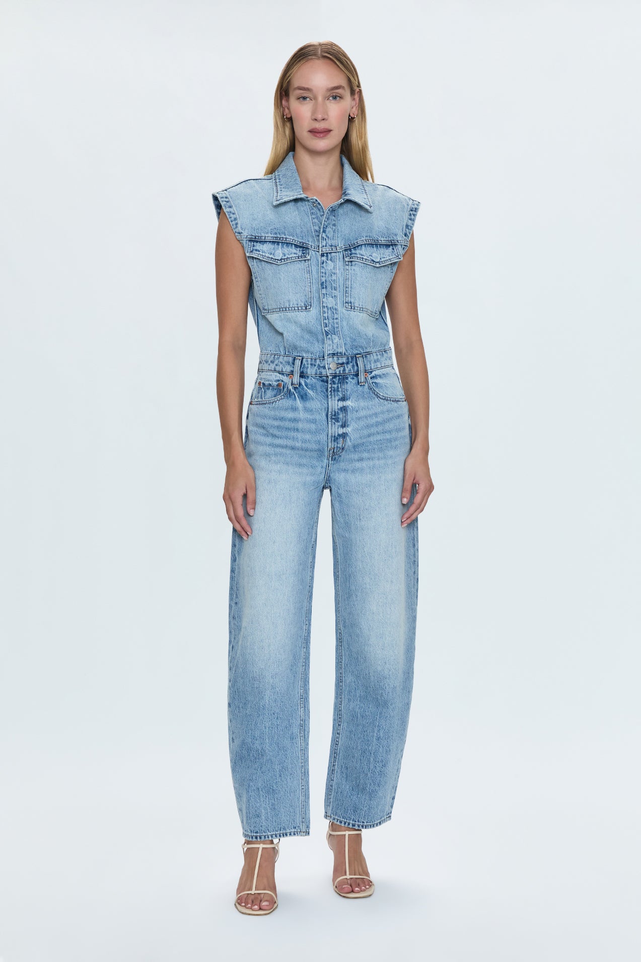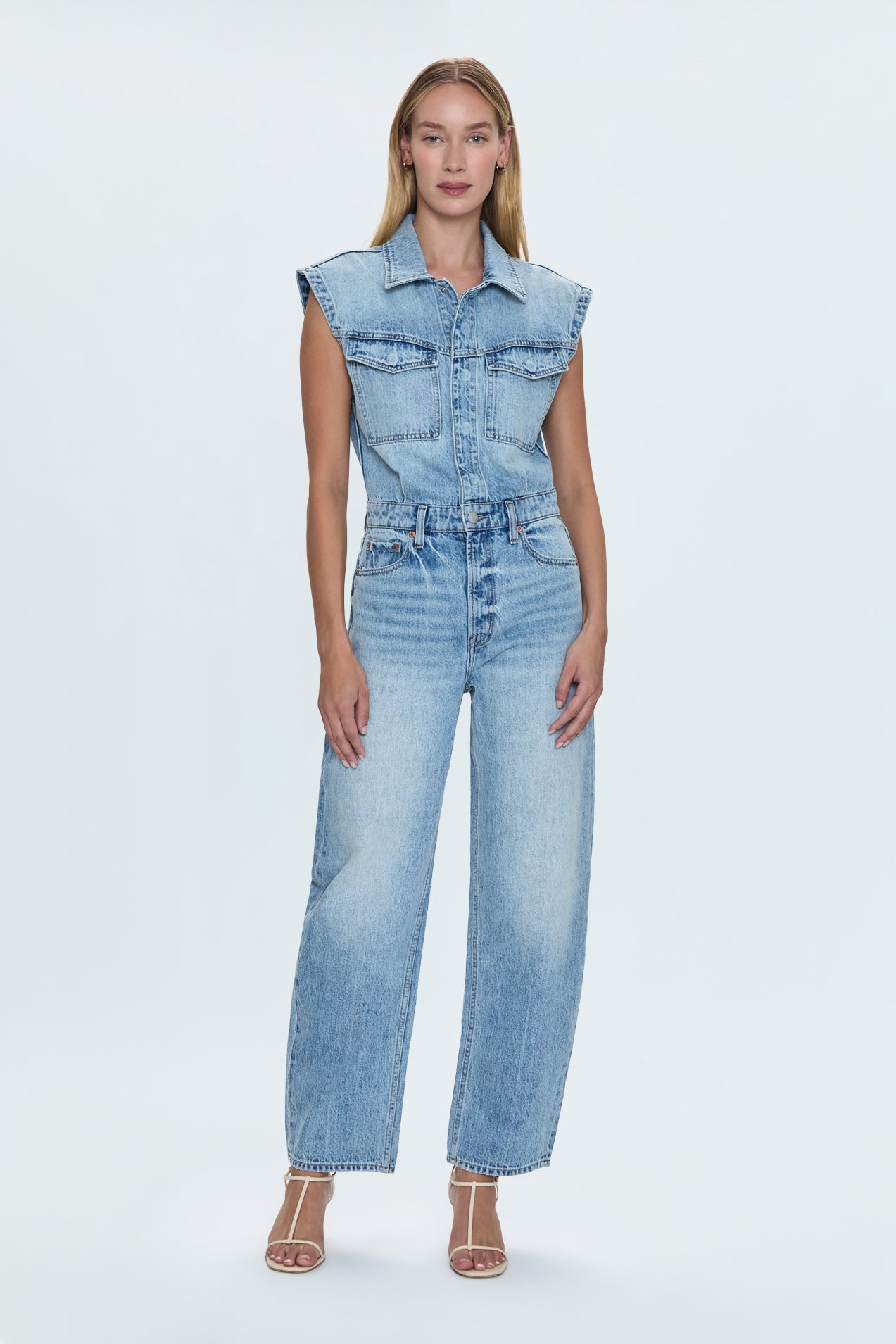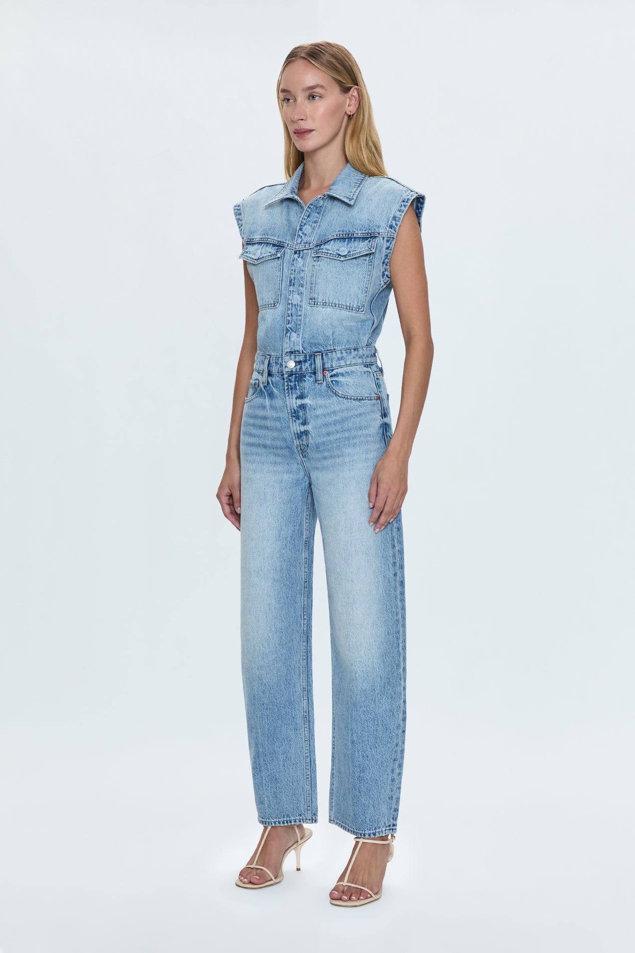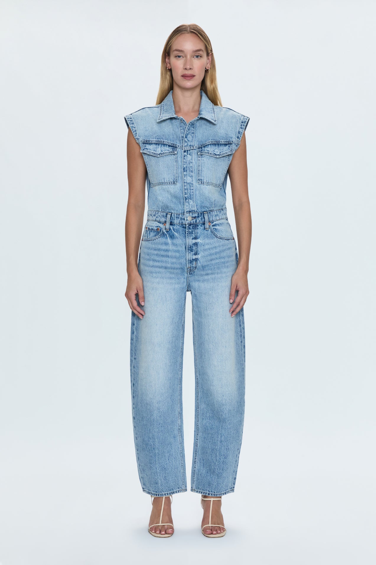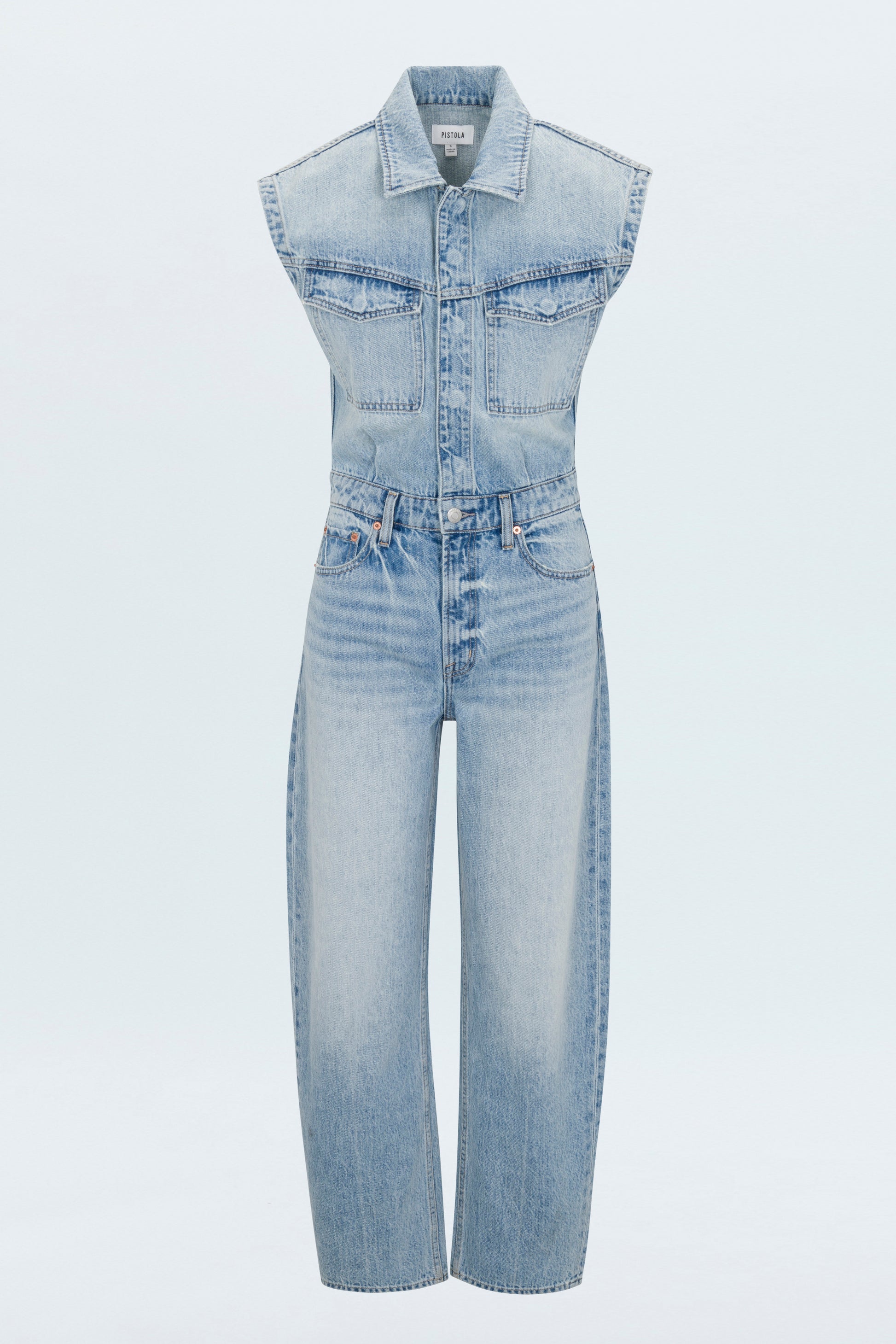 The Ace jumpsuit boasts a strong shoulder, nipped waist and barrel leg silhouette, cut in rigid indigo denim and washed in a light vintage wash.