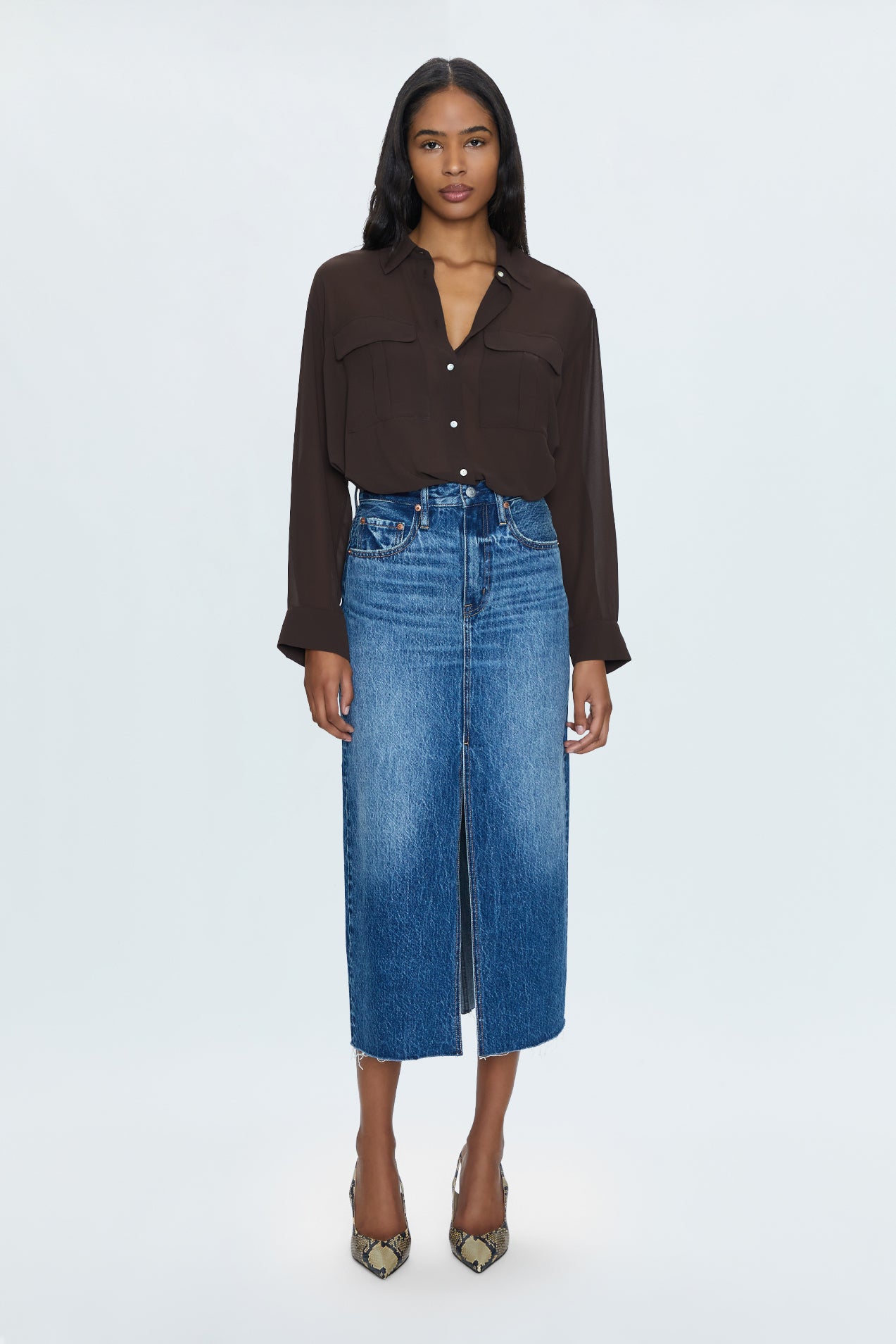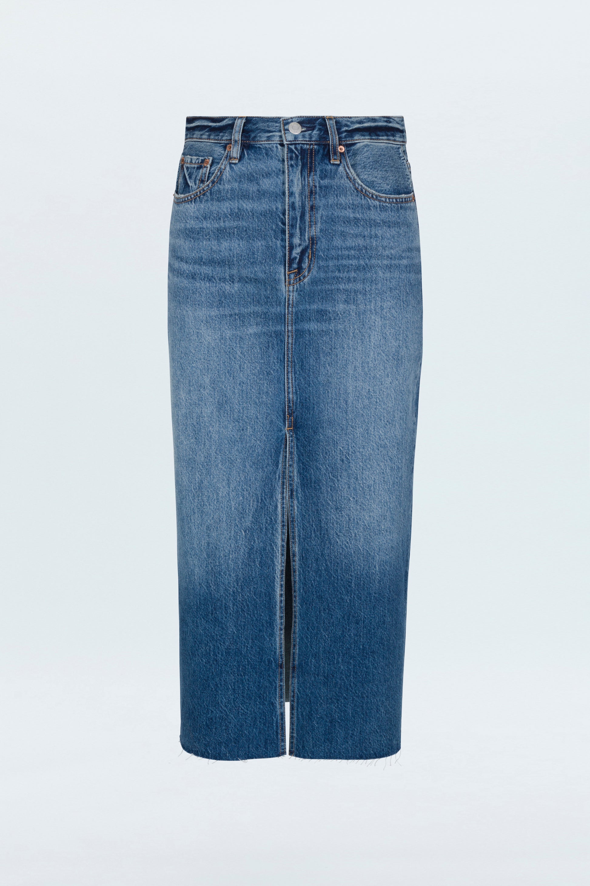 Of-the-moment, yet eternally stylish - our best selling skirt features an elongated midi length, high rise waist, and five pocket denim design notes. Crafted from rigid denim without stretch for sophisticated fit and fall, with a well considered front skirt slit for ease of movement. Fairfax is a medium blue denim wash with moderate fading and wiskering, finished with a scissor cut hem.