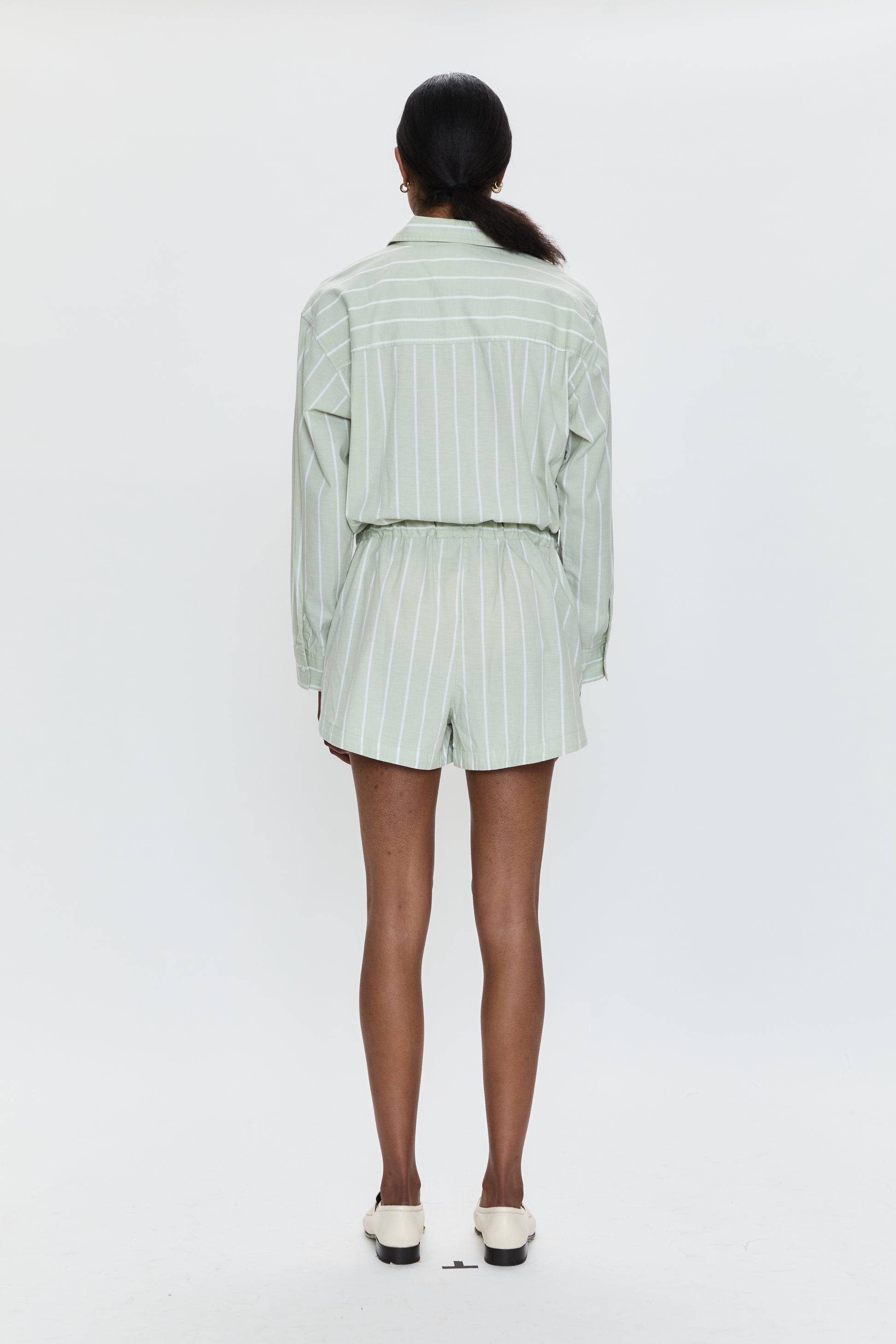 Breezy, transitional romper crafted from lightweight cotton poplin. Designed with a collared, button up bodice that falls into a relaxed short silhouette with an adjustable drawstring waist. Pistachio Stripe is a cool like green contrasted by a white pinstripe overlay.