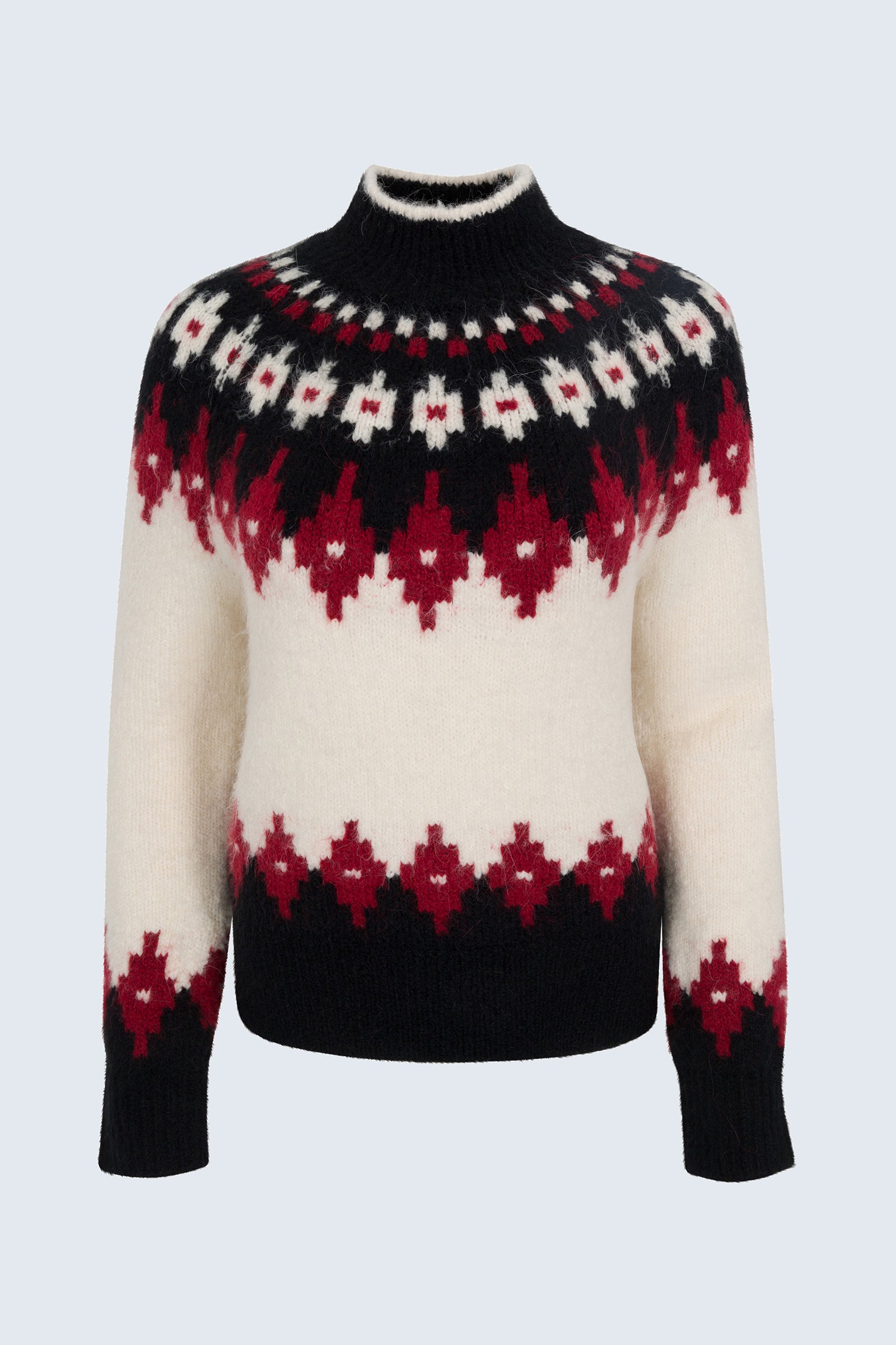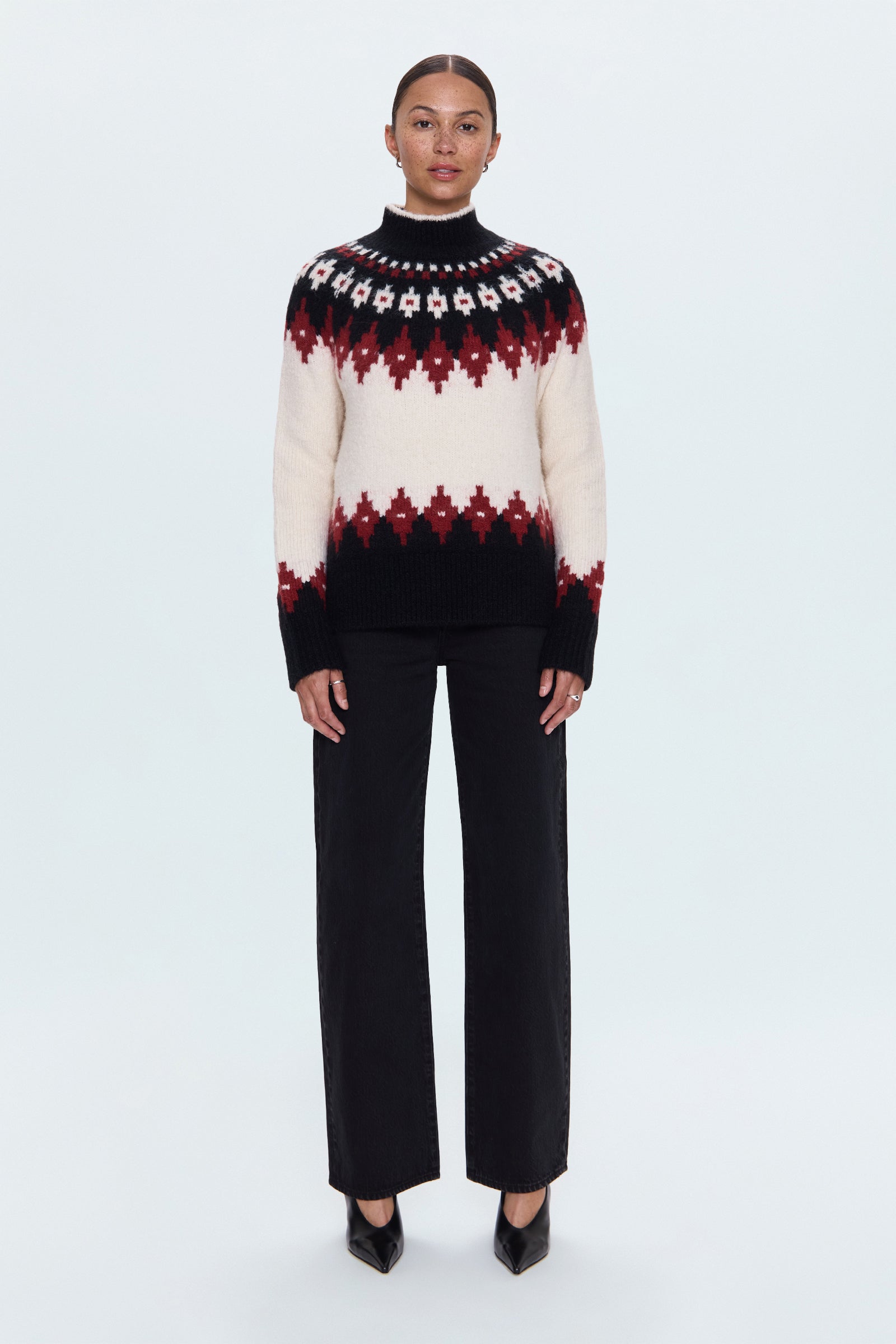 A modern update to a heritage knit, Astrid reimagines the classic Fair Isle with bold contrast tones and an easy pullover fit that feels equal parts cozy and refined. Crafted from a soft, substantial blend of acrylic, wool, alpaca, and nylon. White Oxblood Fair Isle brings a graphic contrast that transitions effortlessly from après-ski to city days.