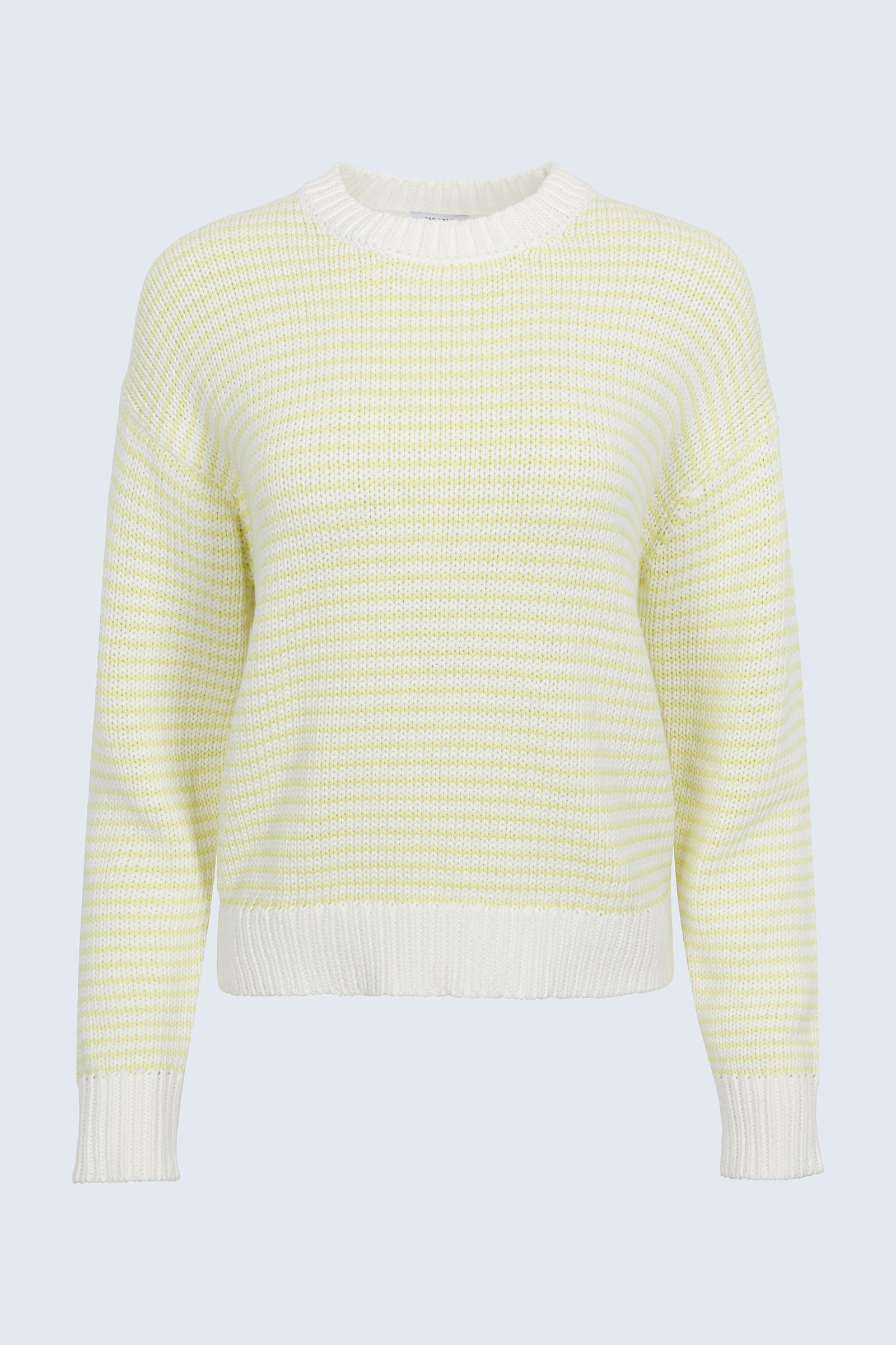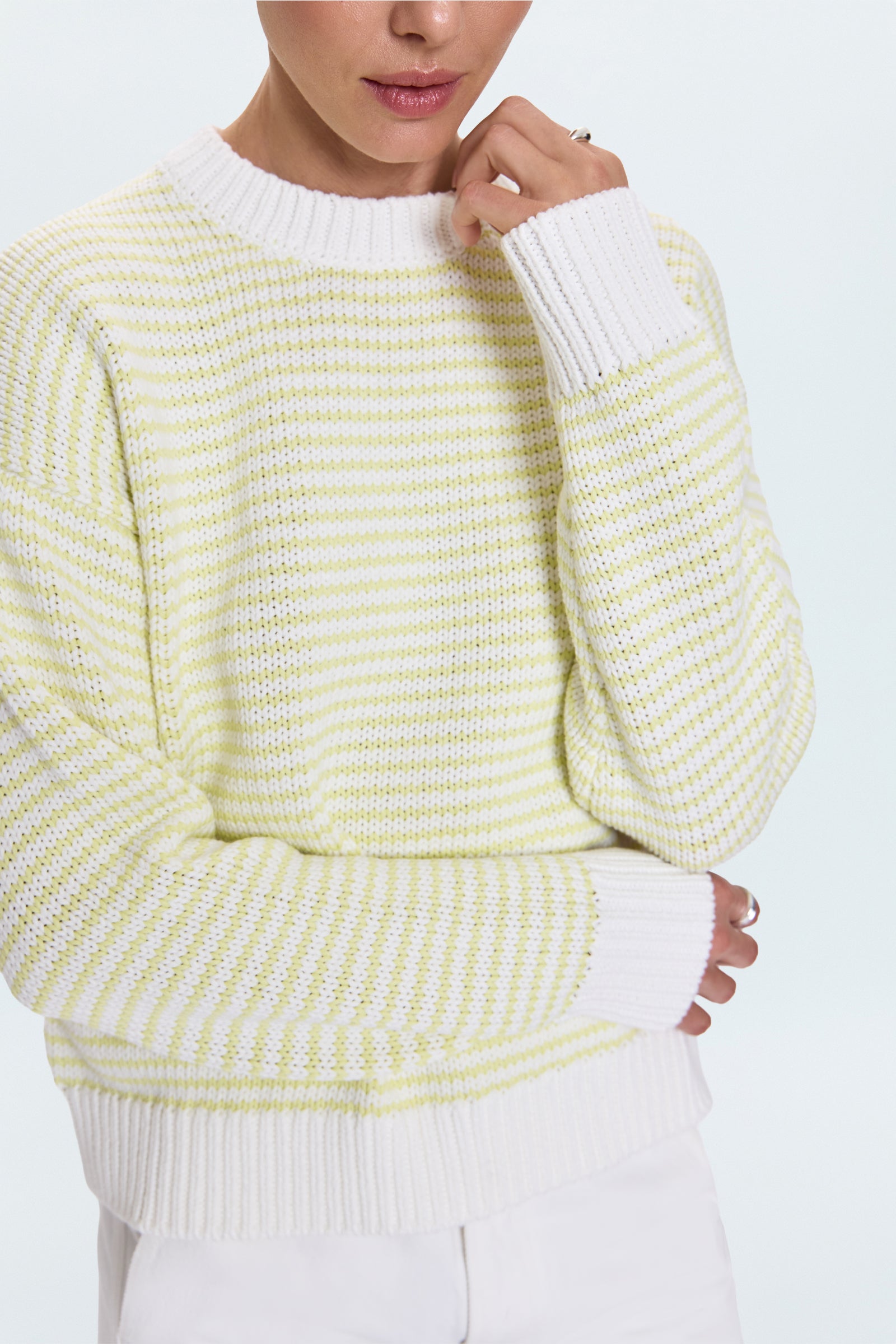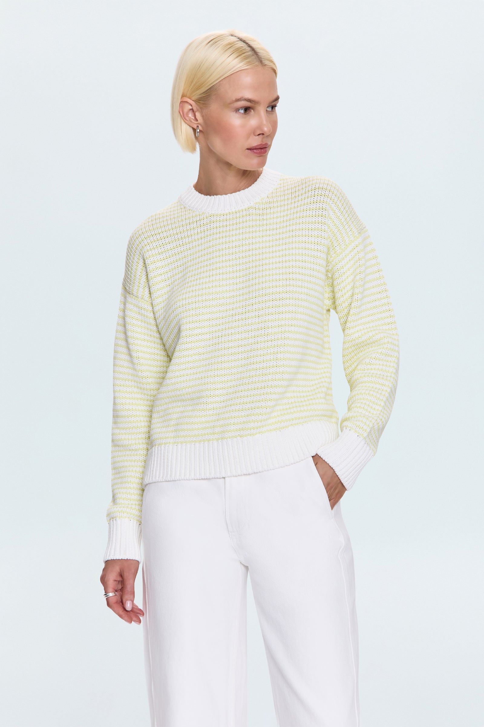 A classic made modern, Aura features a crew neckline and relaxed fit that drapes effortlessly over denim, trousers, or skirts. Knit from 100% cotton, it’s soft yet structured—easy to layer, easy to love. Finished with ribbed details for a touch of texture. Limeade, a refreshing pastel green, adds a playful hit of color that brightens the season.