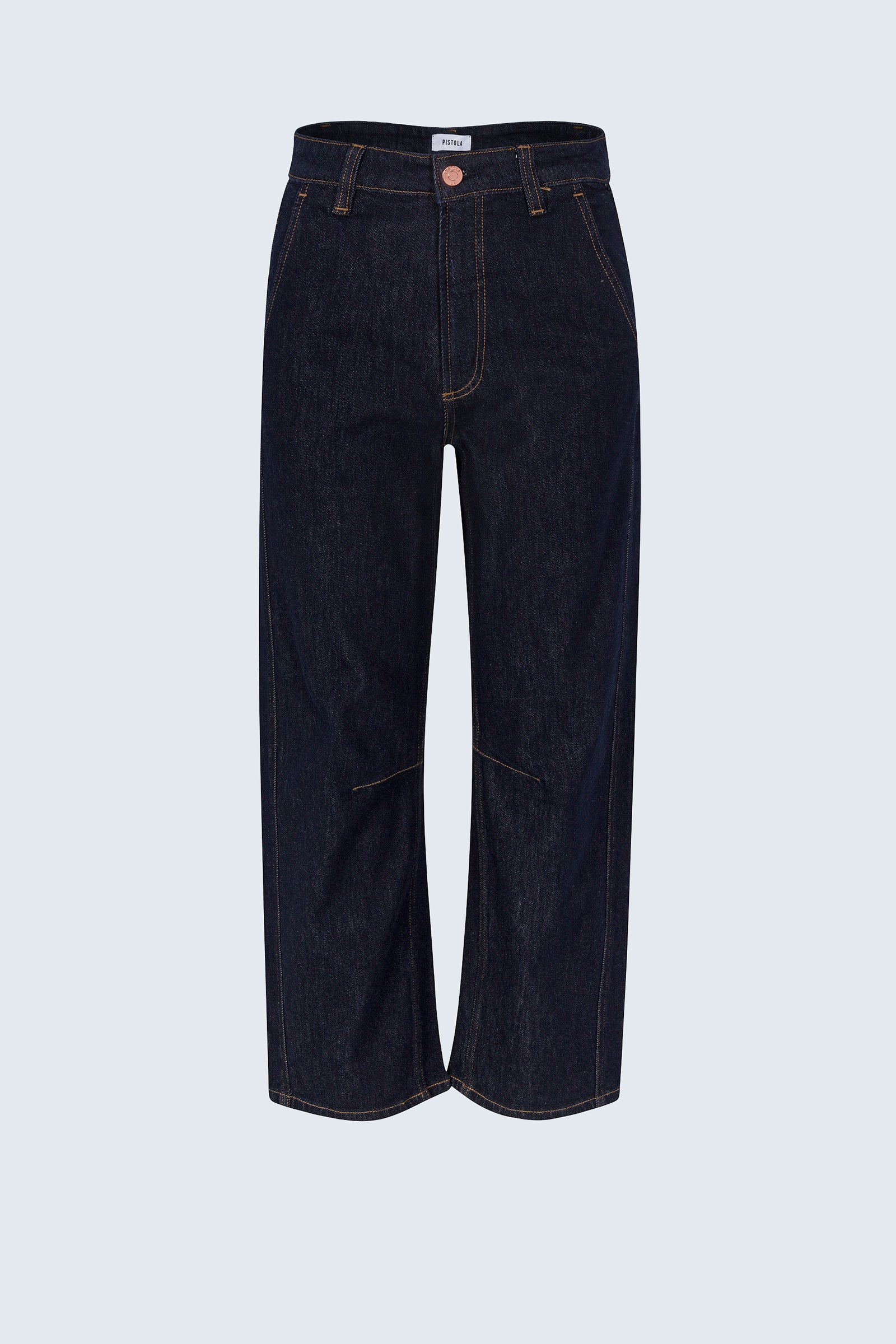 The bowed straight with architectural intent. Beau delivers unique seamed crescent details and a cropped 27" inseam that creates dimensional interest. Crafted from rigid non-stretch denim in Nightfall, a deep dark rinse wash that captures the allure of midnight. Our founder, Grace's favorite jean—she loves it paired with the Thea Shrunken Rinse Shirt for effortless sophistication.