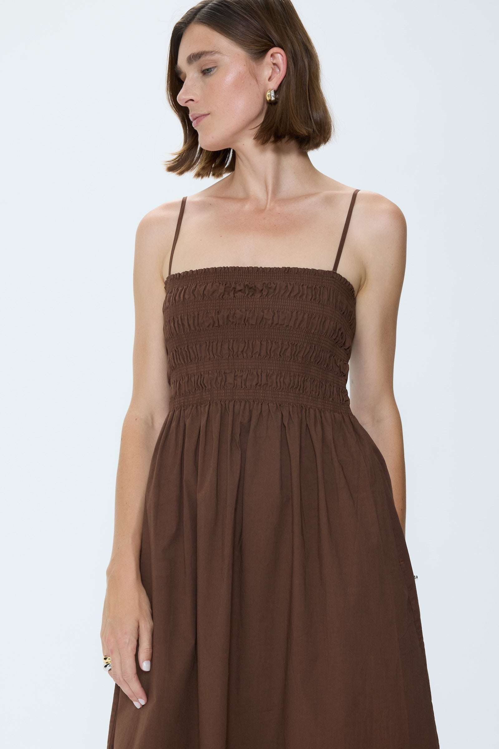 A warm-weather standout, Bianca pairs a fitted shirred bodice with a flowing, above-ankle skirt for a balanced, feminine silhouette. The cotton–spandex fabric delivers light stretch and breathability, ideal for all-day wear with adjustable spaghetti straps that allow for a customizable fit.
