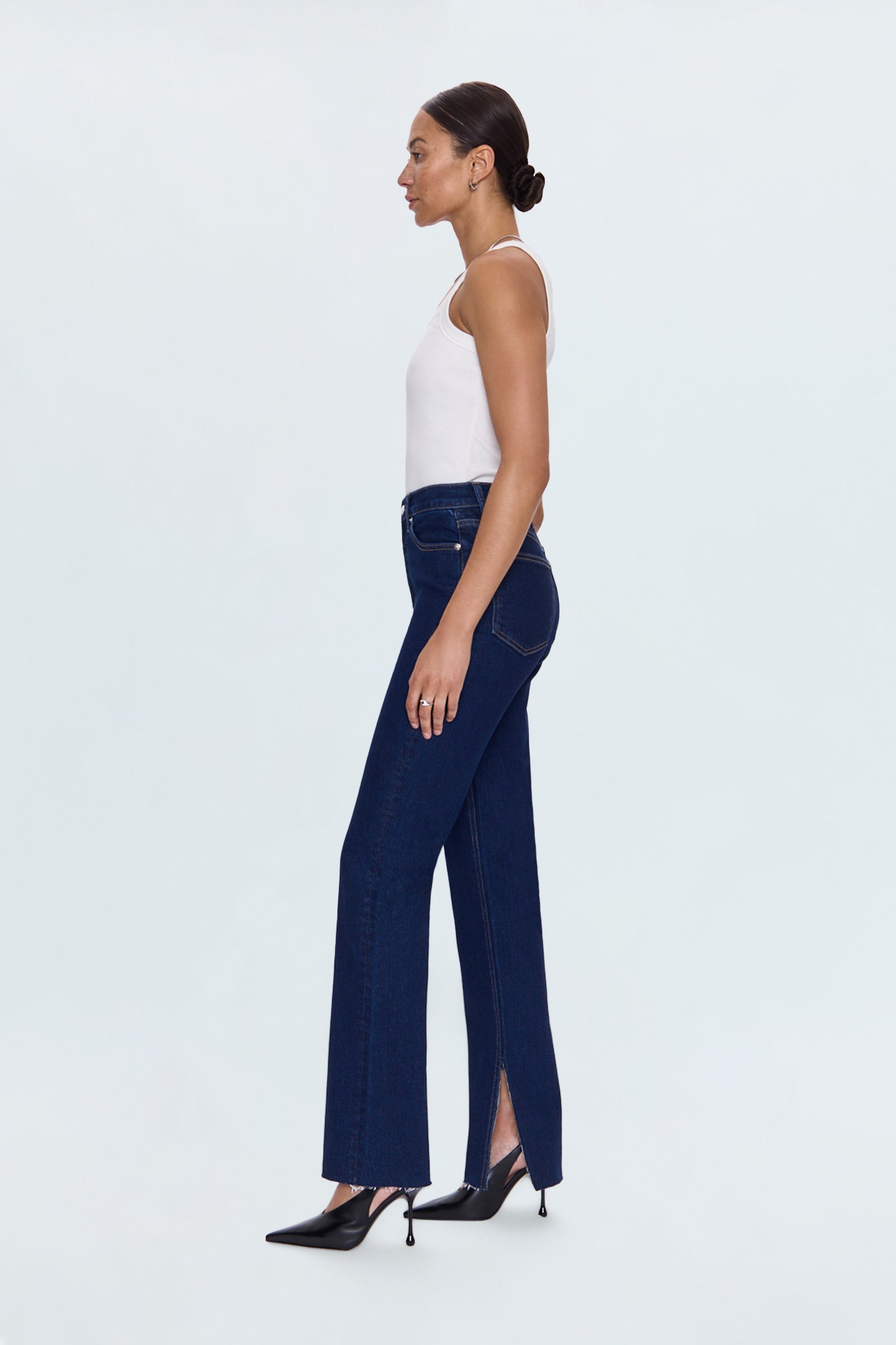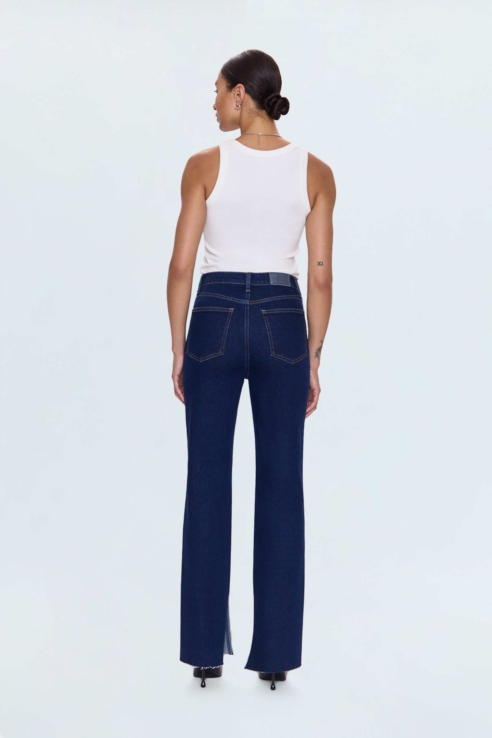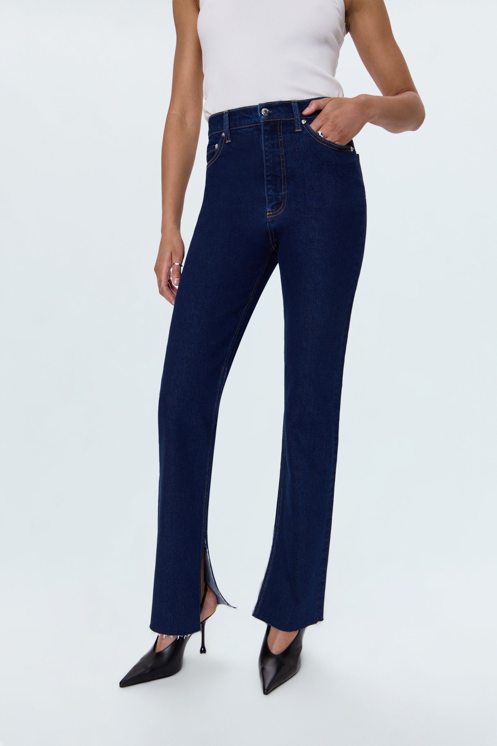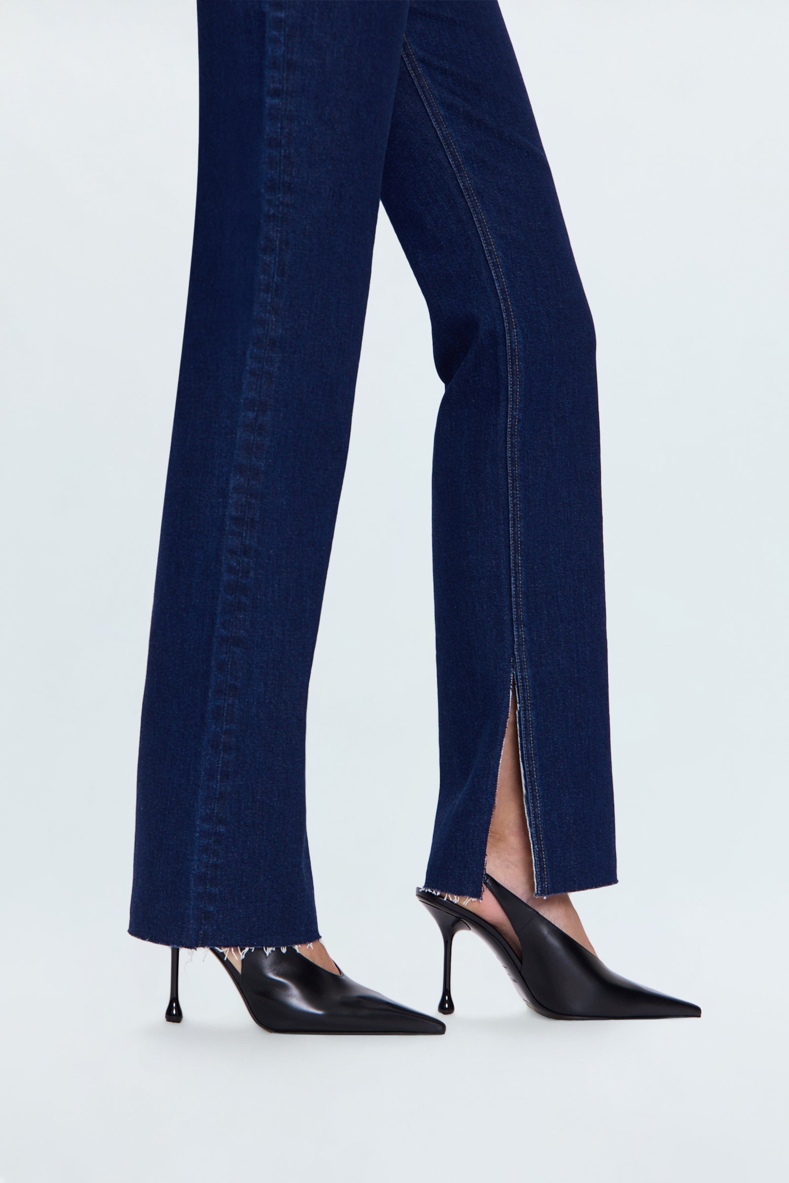 The jean for putting your shoes on display. Colleen sits as a super high rise with a slim boot silhouette and full-length 33" inseam that flatters curves. Its raw hem and inner side slit creates the illusion of longer legs. Crafted from stretch denim that moves with you while maintaining its expert shape. Bijou brings sophisticated depth with its rich dark wash that anchors any look.