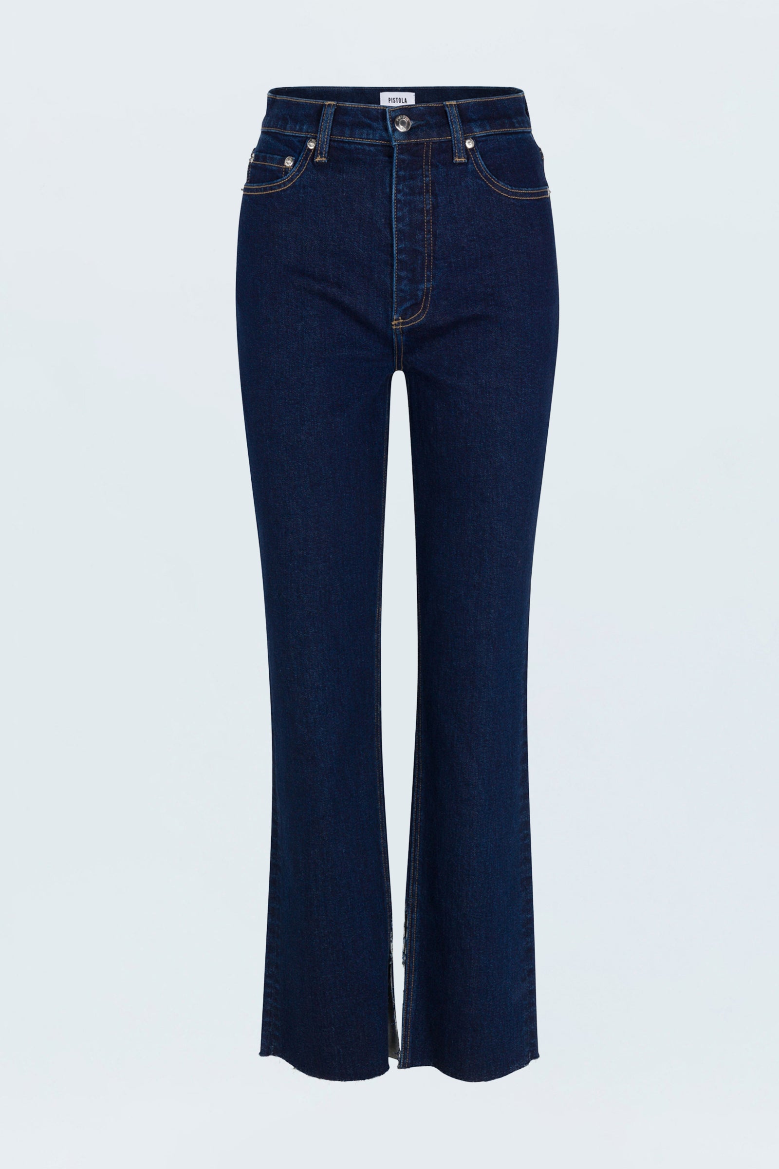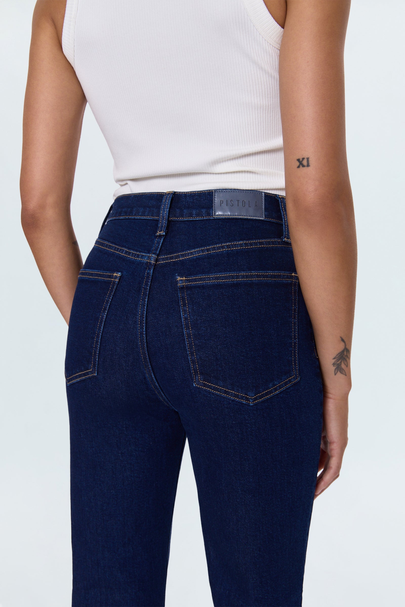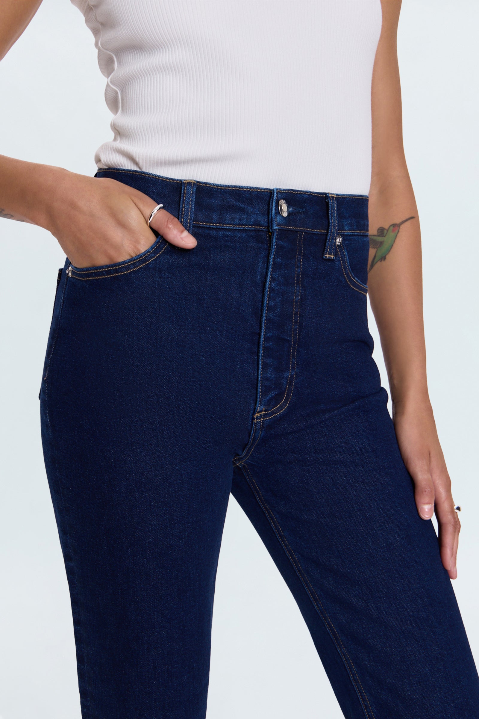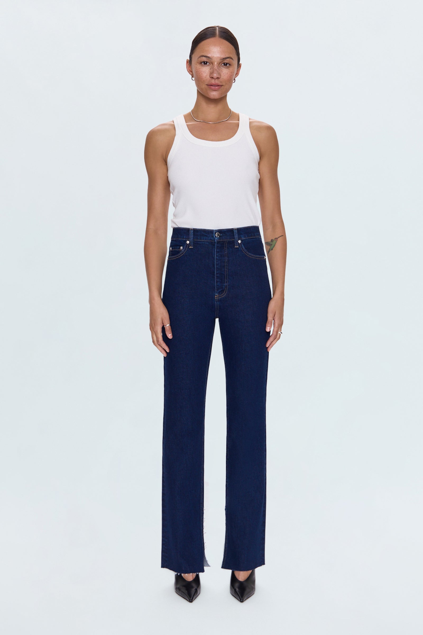 The jean for putting your shoes on display. Colleen sits as a super high rise with a slim boot silhouette and full-length 33" inseam that flatters curves. Its raw hem and inner side slit creates the illusion of longer legs. Crafted from stretch denim that moves with you while maintaining its expert shape. Bijou brings sophisticated depth with its rich dark wash that anchors any look.