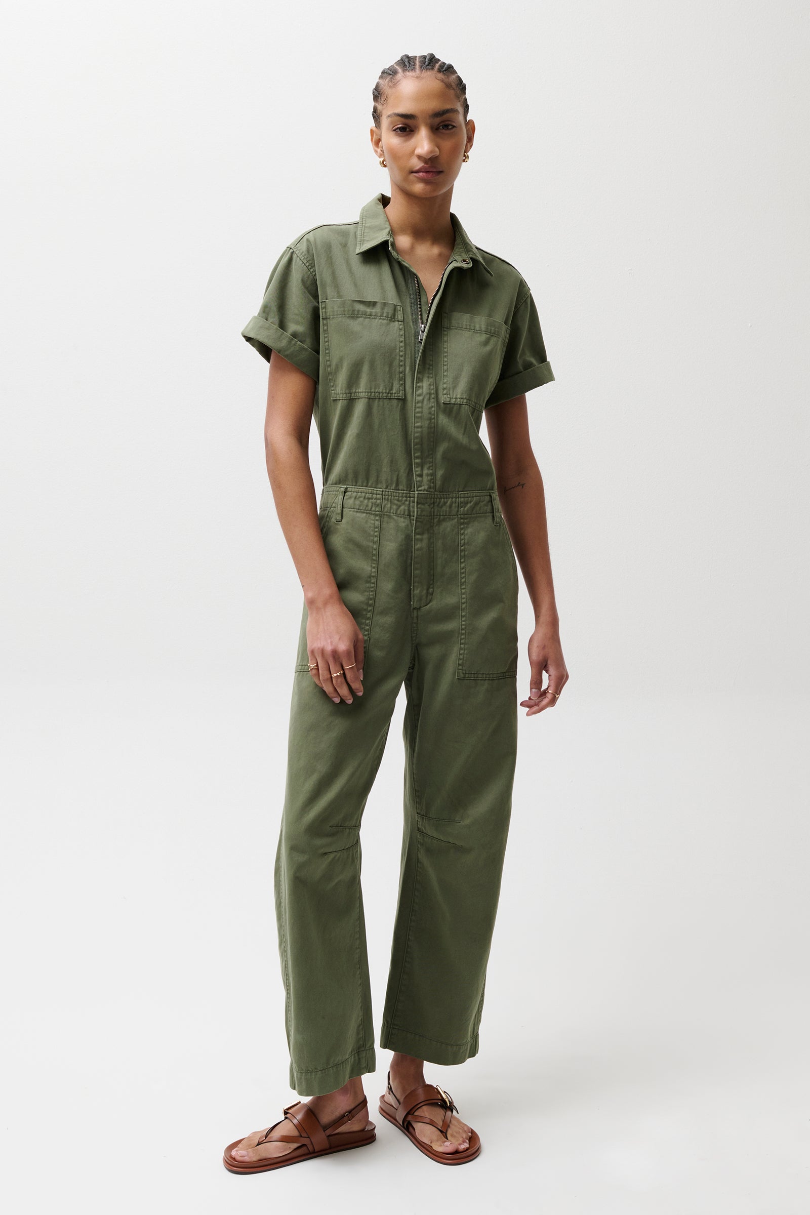 Cruz redefines the everyday jumpsuit with a sculpted barrel leg and streamlined fit. Short sleeves keep the silhouette fresh and wearable with a relaxed fit that feels effortless. Cruz was designed for structure and ease, in Colonel, a deep earthy green, that adds depth and modern utility to this essential silhouette.