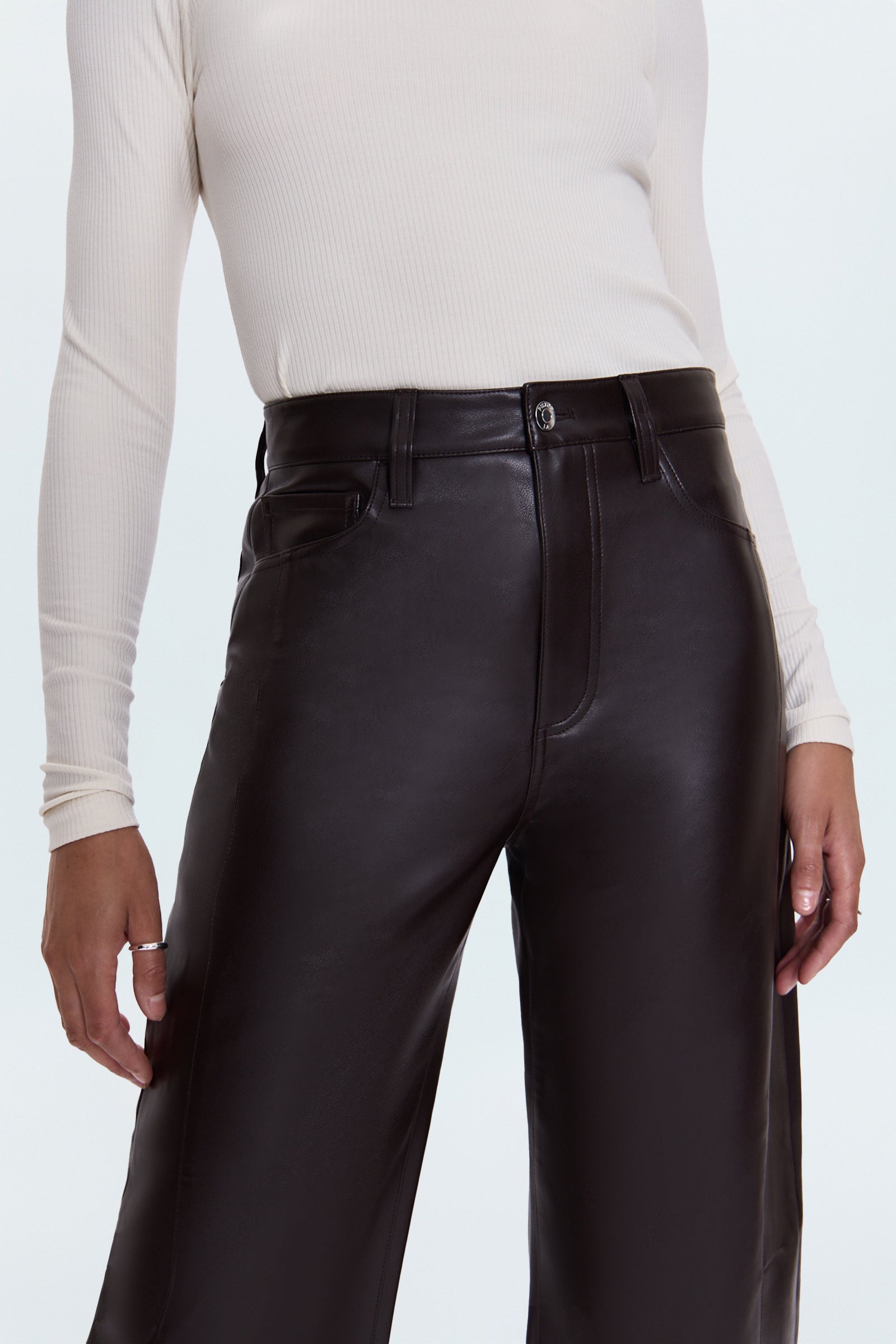 A modern barrel silhouette, Eli features a high rise, arched leg, and cropped 26" inseam for bold proportion. Crafted from buttery-soft alt leather in French Roast, a rich espresso brown that delivers sleek sophistication and everyday versatility.
