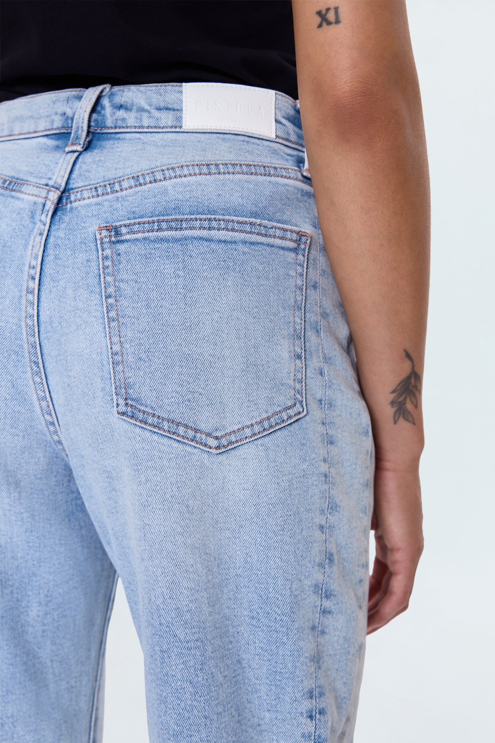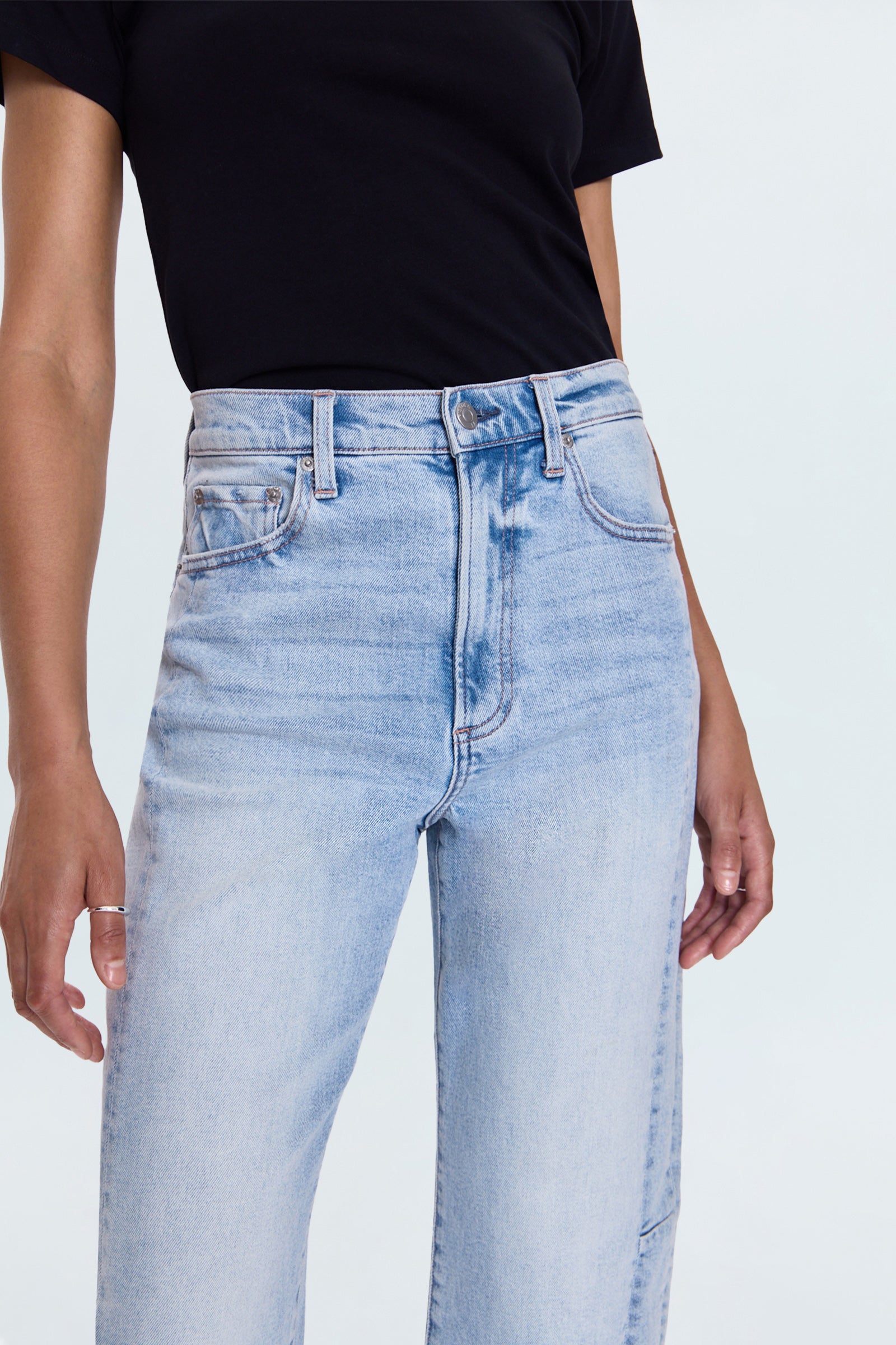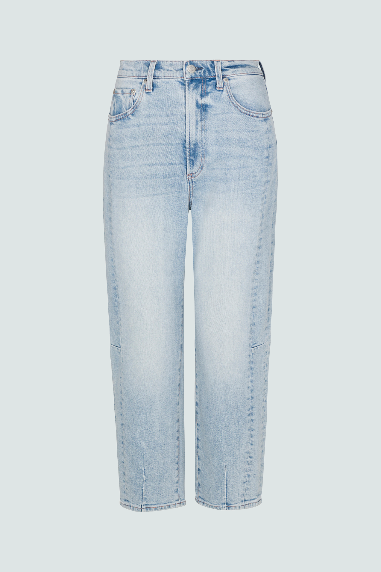 Ray of light. An arresting, modern silhouette achieved designed with a subtle bowed silhouette and a relaxed leg fit. Crafted from our wear-everywhere comfort stretch denim. Sun-kissed is a light blue, blasted denim wash with a contoured, slimming fade and whisker details.