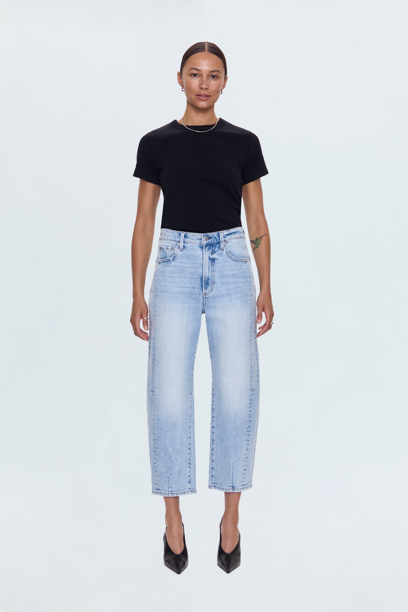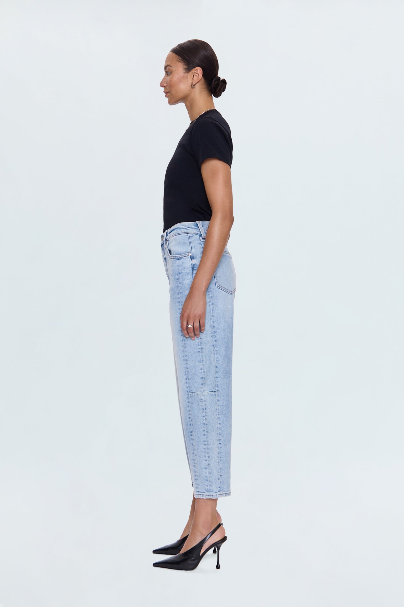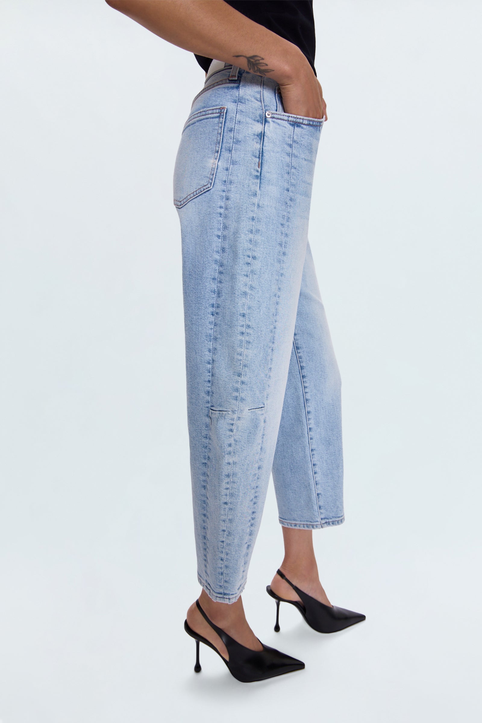 Ray of light. An arresting, modern silhouette achieved designed with a subtle bowed silhouette and a relaxed leg fit. Crafted from our wear-everywhere comfort stretch denim. Sun-kissed is a light blue, blasted denim wash with a contoured, slimming fade and whisker details.