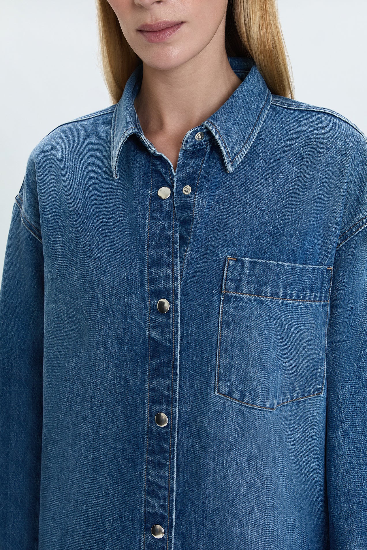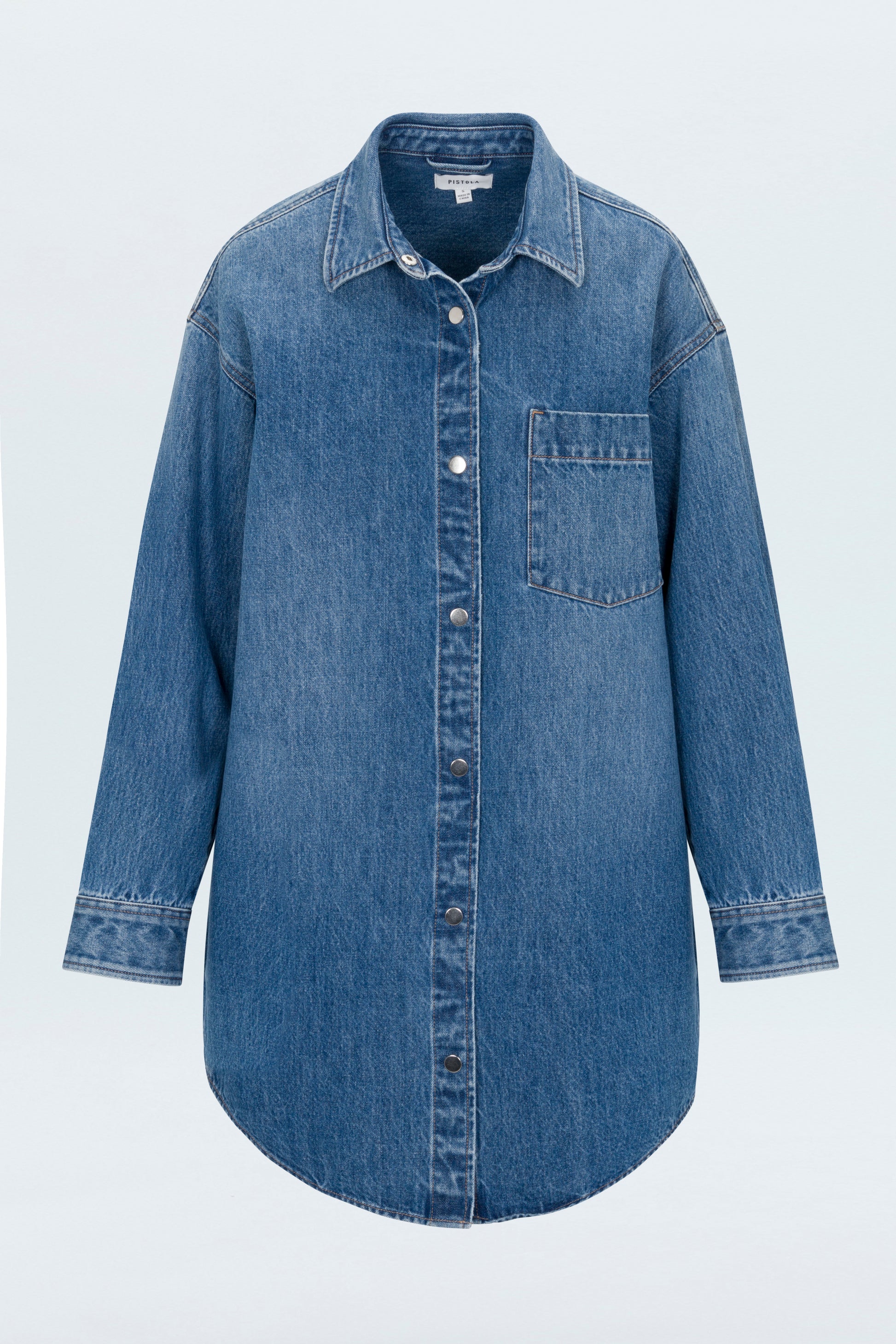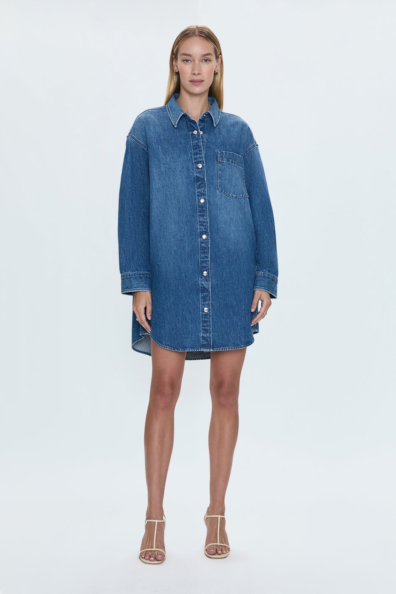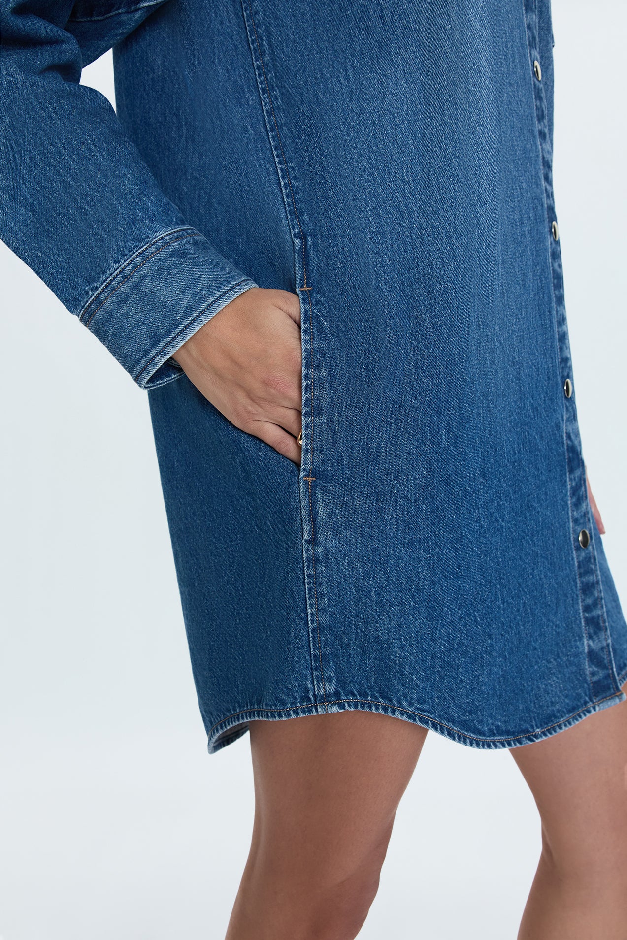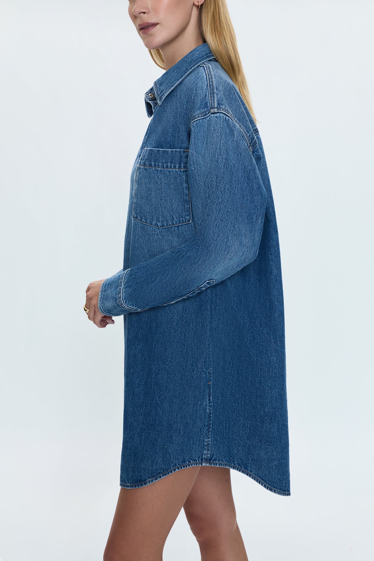 The Elle shirt dress is cut in a classic indigo denim with an elevated mid shade wash, versatile and modern with snap detailing, the Elle can be worn as a dress or layering piece.