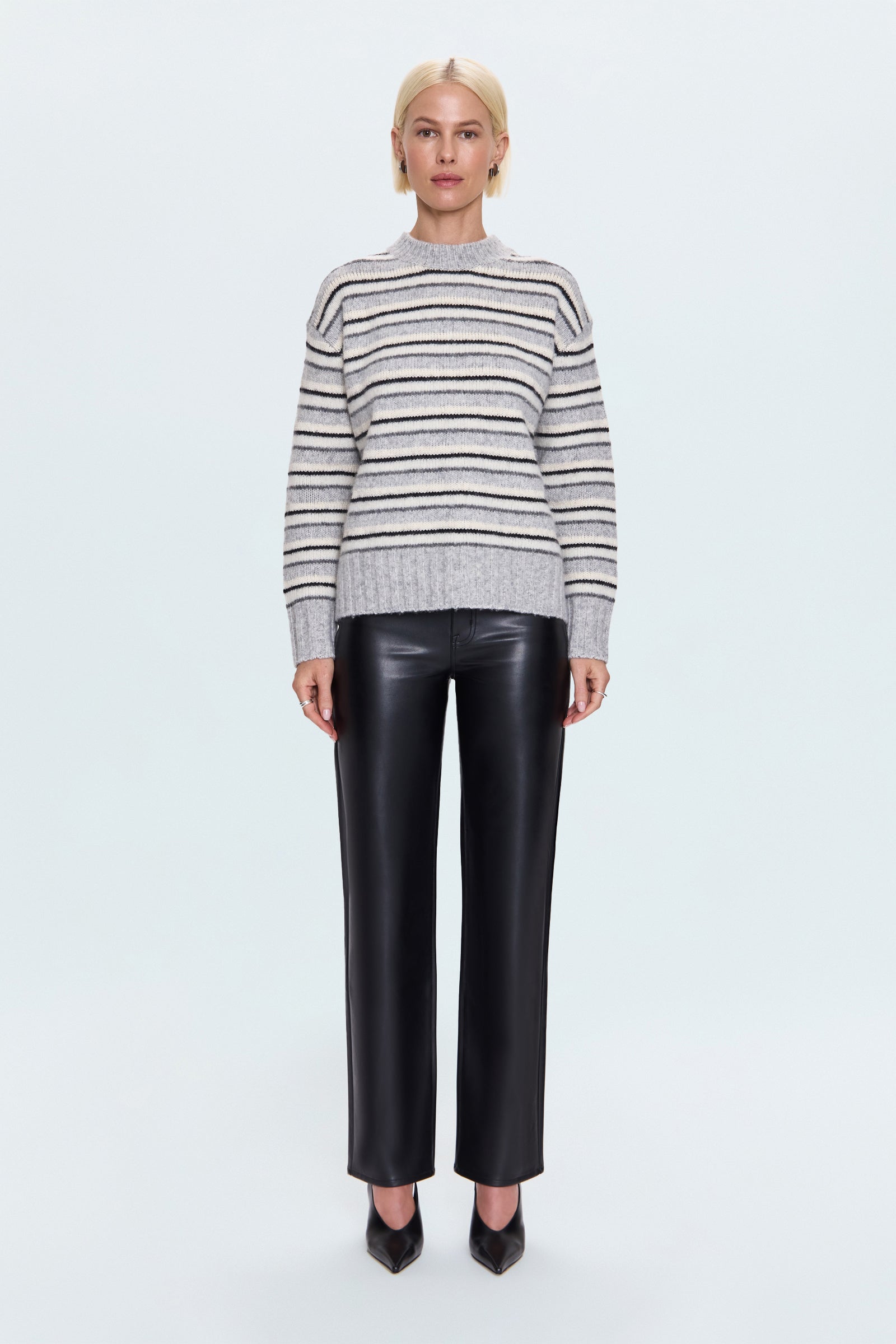 A modern essential, Hanna features an oversized fit that drapes effortlessly while maintaining its shape for a balance of comfort and structure. Knit from a wool-cotton blend, it’s soft yet substantial—perfect for layering or wearing solo. Variegated stripes in Grey White bring subtle texture and a graphic, contemporary finish.