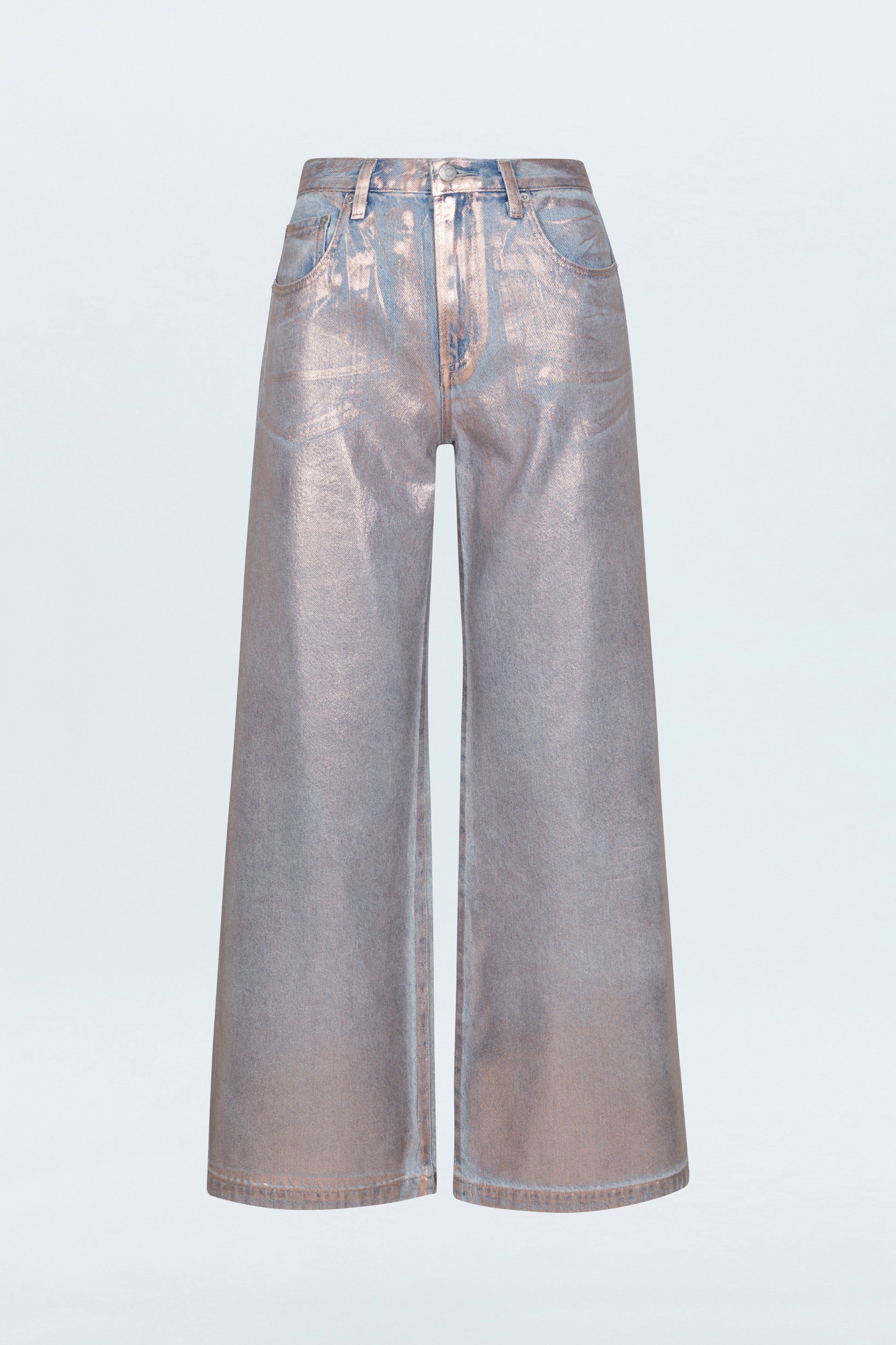 The it-girl fit. Jadyn is designed to sit low on the hips, with a relaxed palazzo leg silhouette. Crafted from a lightweight rigid denim without stretch that holds it shape. Tinsel is a metallic coated denim with foil print texture offered in a soft lavender-pink hue.