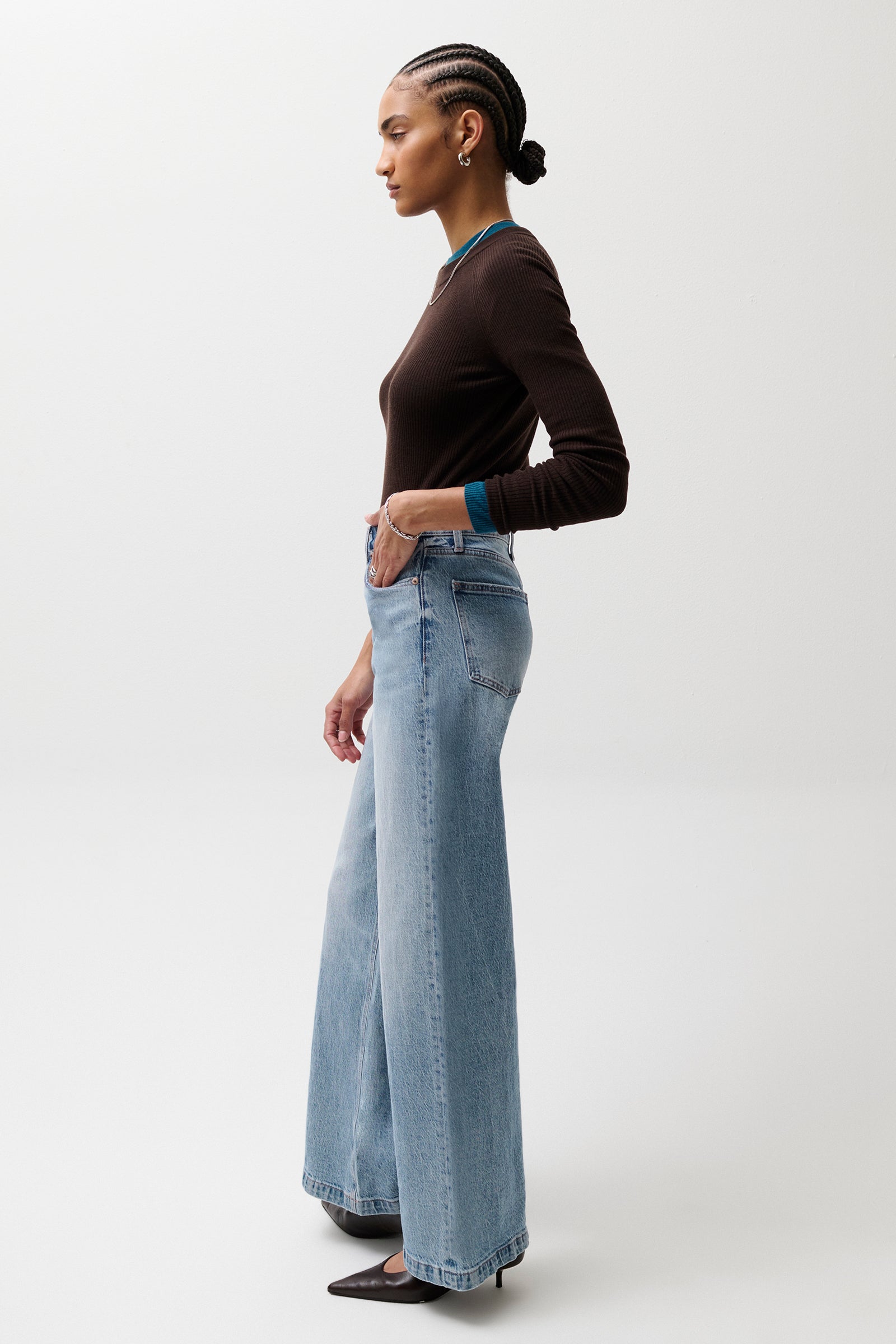 The best-selling wide leg that makes a statement. Lana commands space with her ultra wide silhouette and high-rise waist. The relaxed leg flows to a full-length hem, with a 33" inseam that adds just the right amount of drama. Crafted from our signature comfort stretch denim in Break, a light wash.