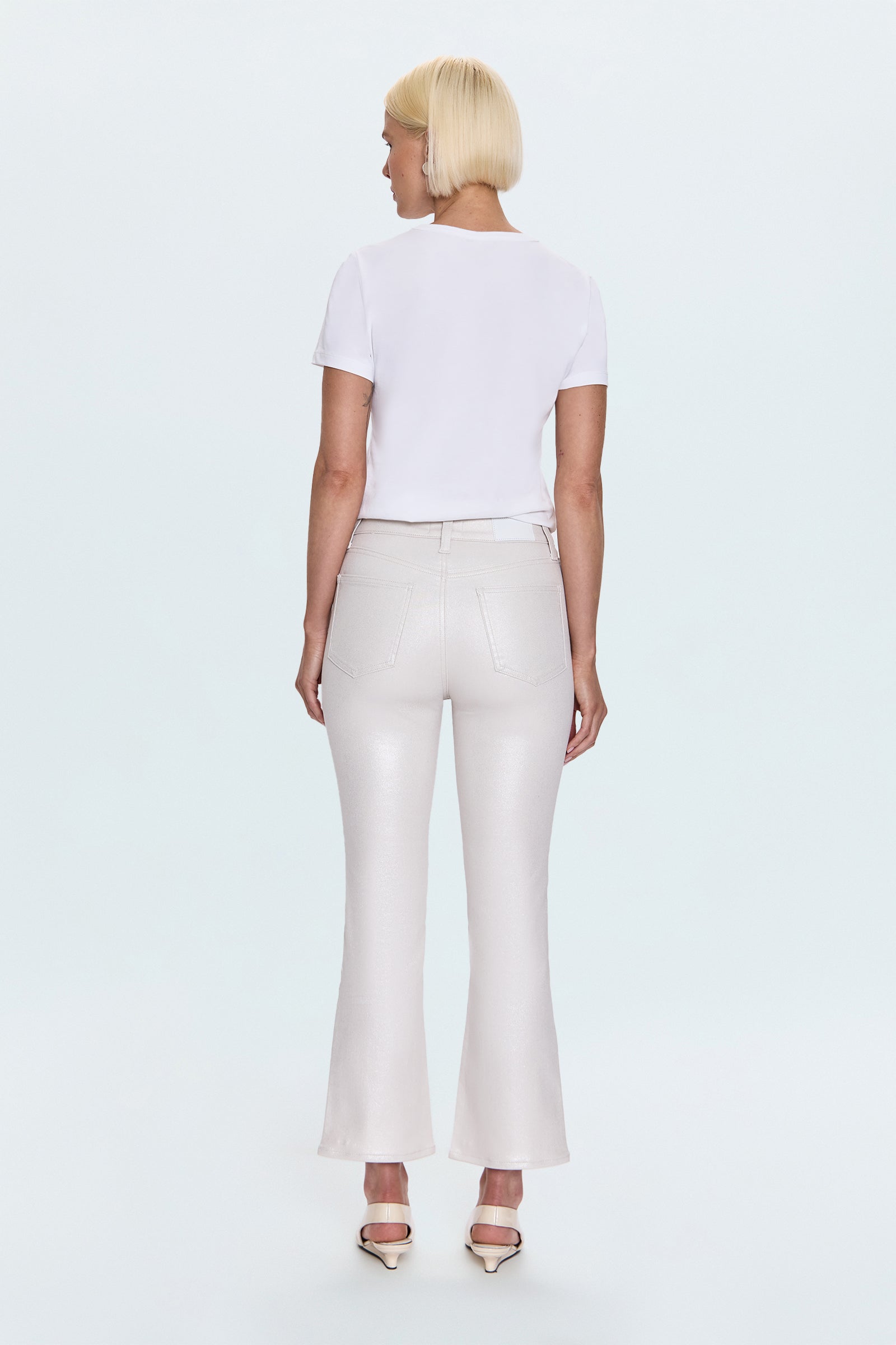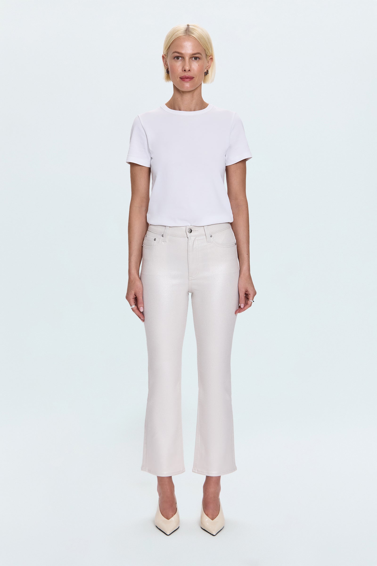 A modern take on the classic bootcut, Lennon features a high rise and slim fit through the hips and thighs before subtly flaring at the calf for balanced proportion. The cropped 27" inseam flatters every shoe, from heels to flats. Crafted from high-stretch fabric in Ivory Luster, a pearly off-white with a sleek coated finish that adds soft sheen and elevated polish.