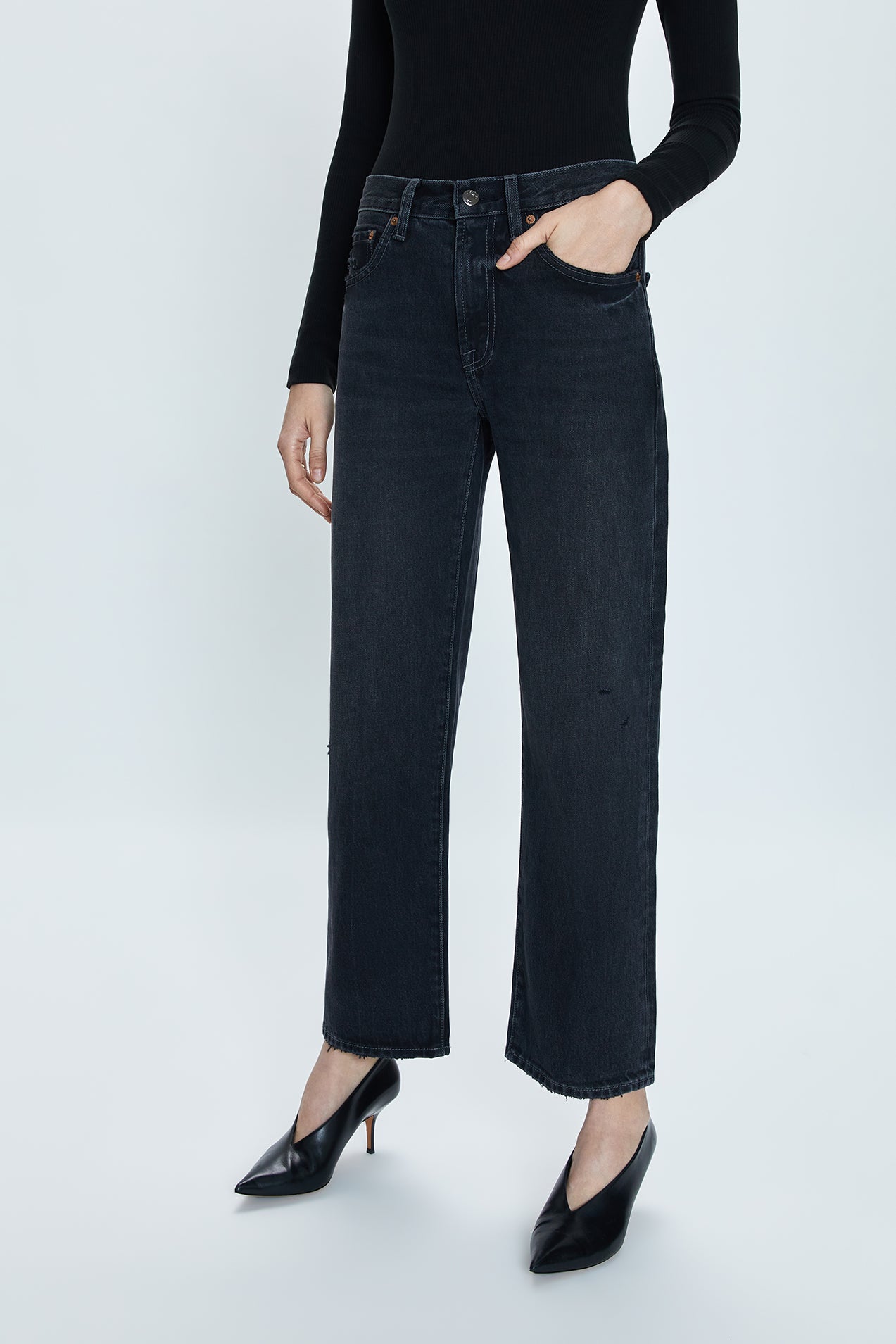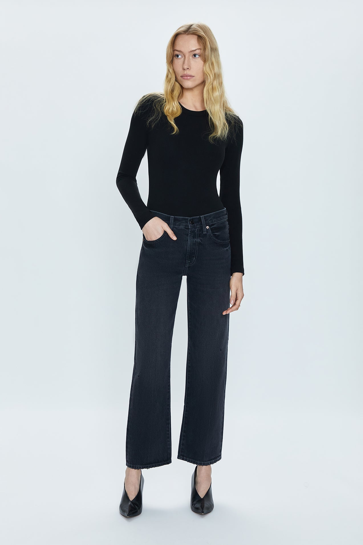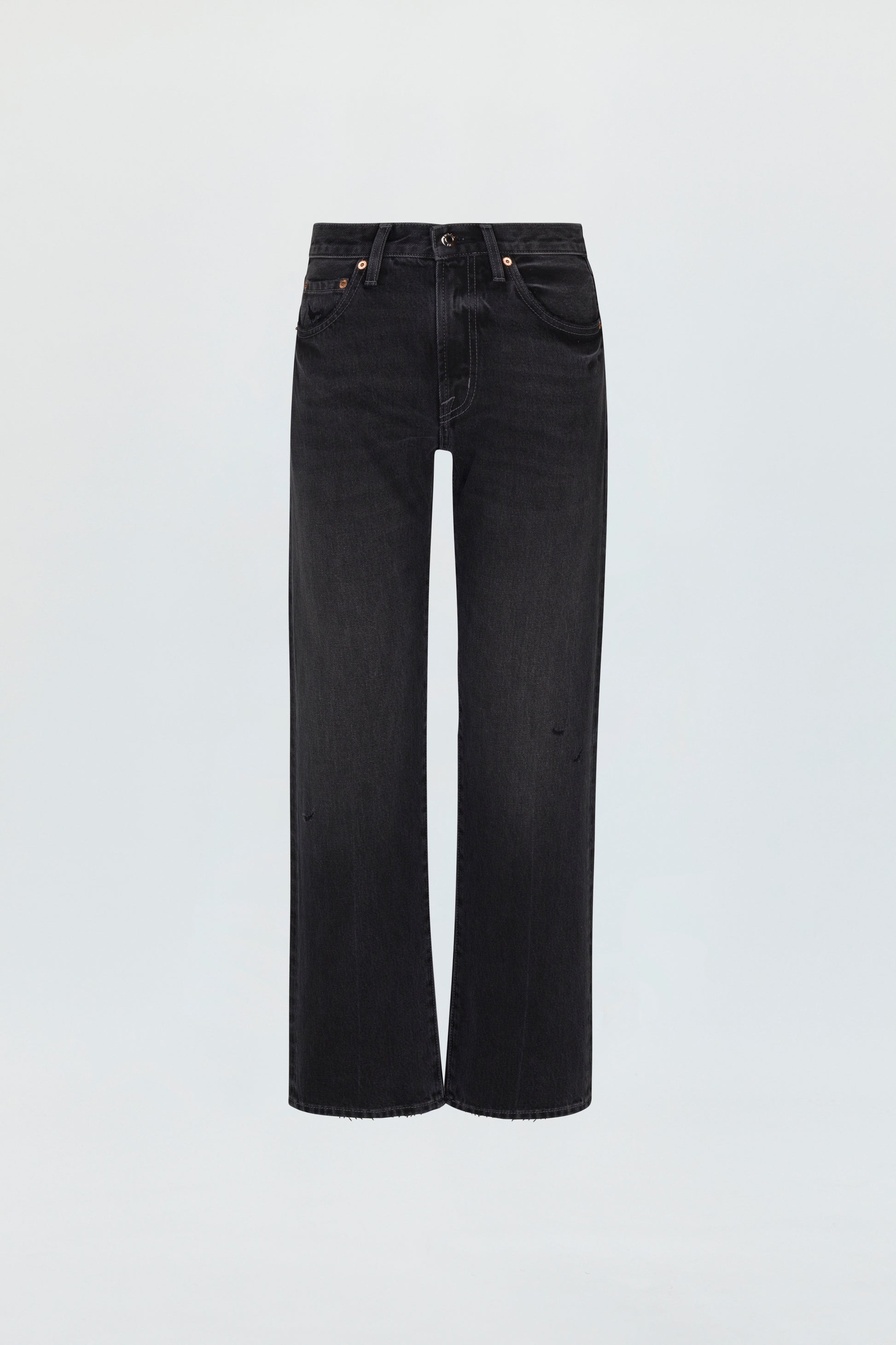 The best-selling jean that understands proportions. Lexi sits at the perfect mid-rise with our signature bowed straight leg, a subtle curve at the knee that creates dimension without effort. Finished with a 29" inseam, the sculpted silhouette tapers to a cropped ankle with gentle knicks at the knee and a clean hem. Crafted from our rigid denim in Mercury, a faded black wash.