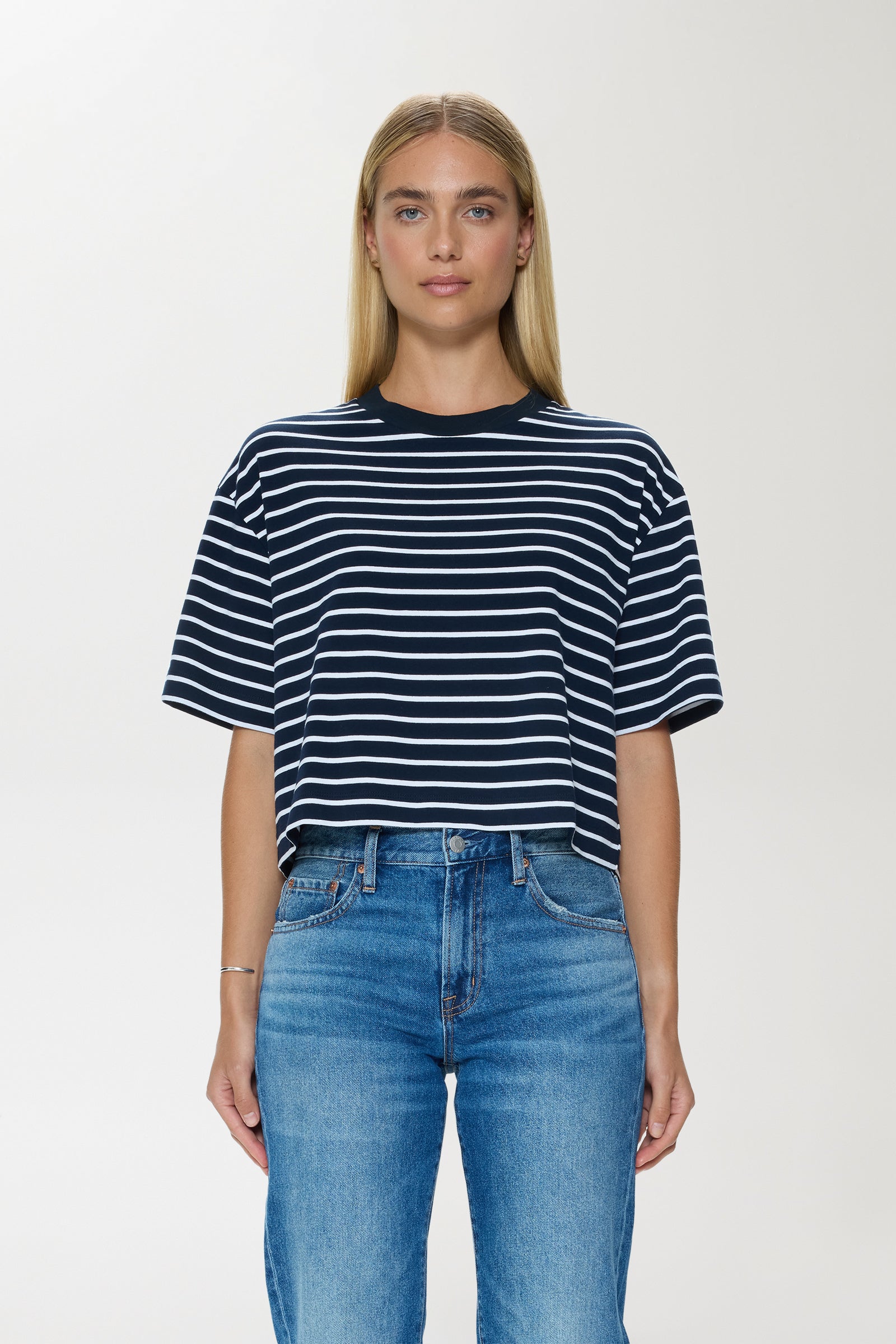 Mae updates the essential tee with an oversized fit, crisp half sleeves, and a clean, cropped length. The open-back cutout softens the silhouette and adds a subtle, feminine reveal. In a navy and white stripe, it brings versatility to a classic, borrowed-from-the-boys shape.