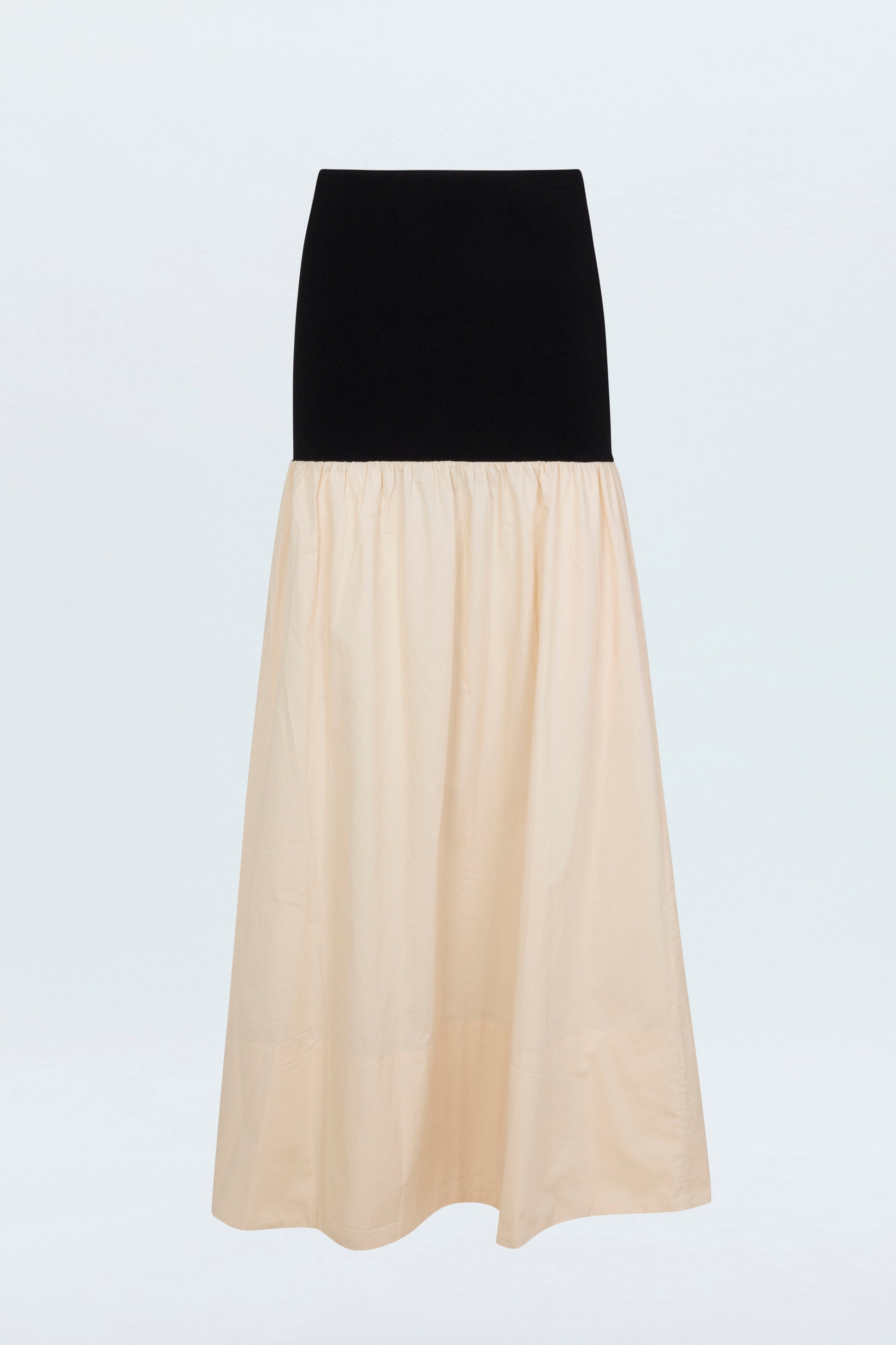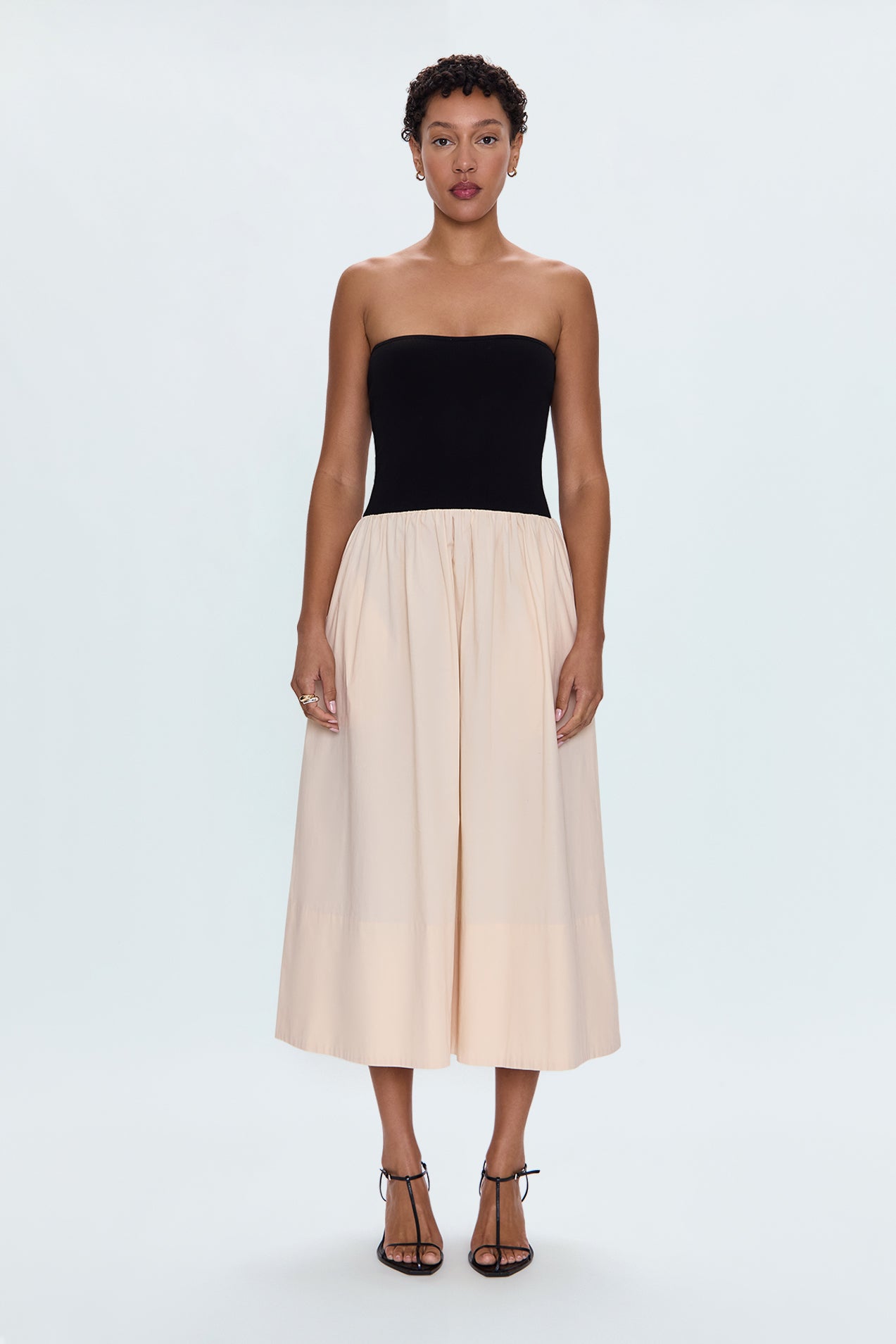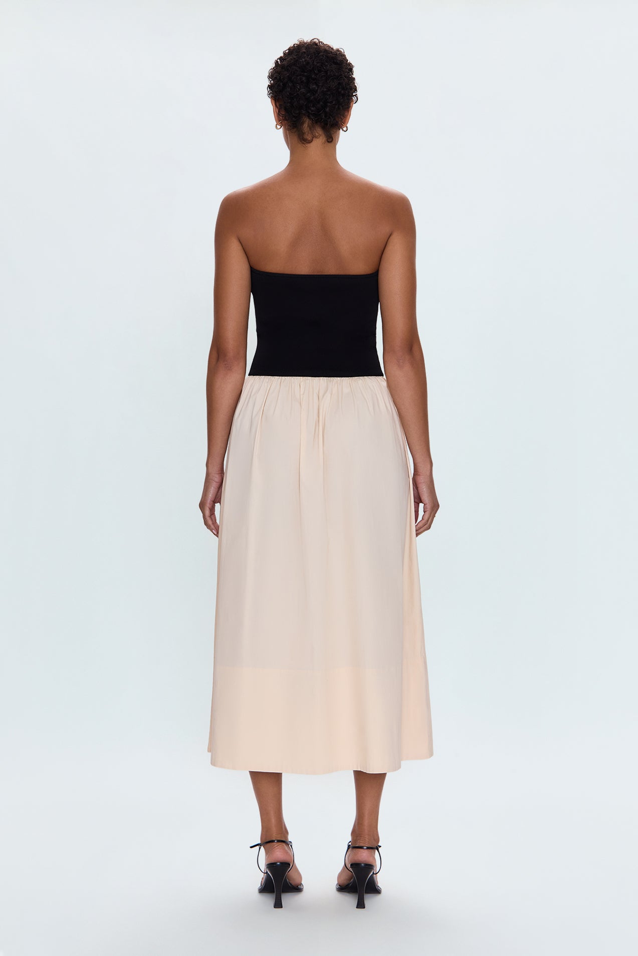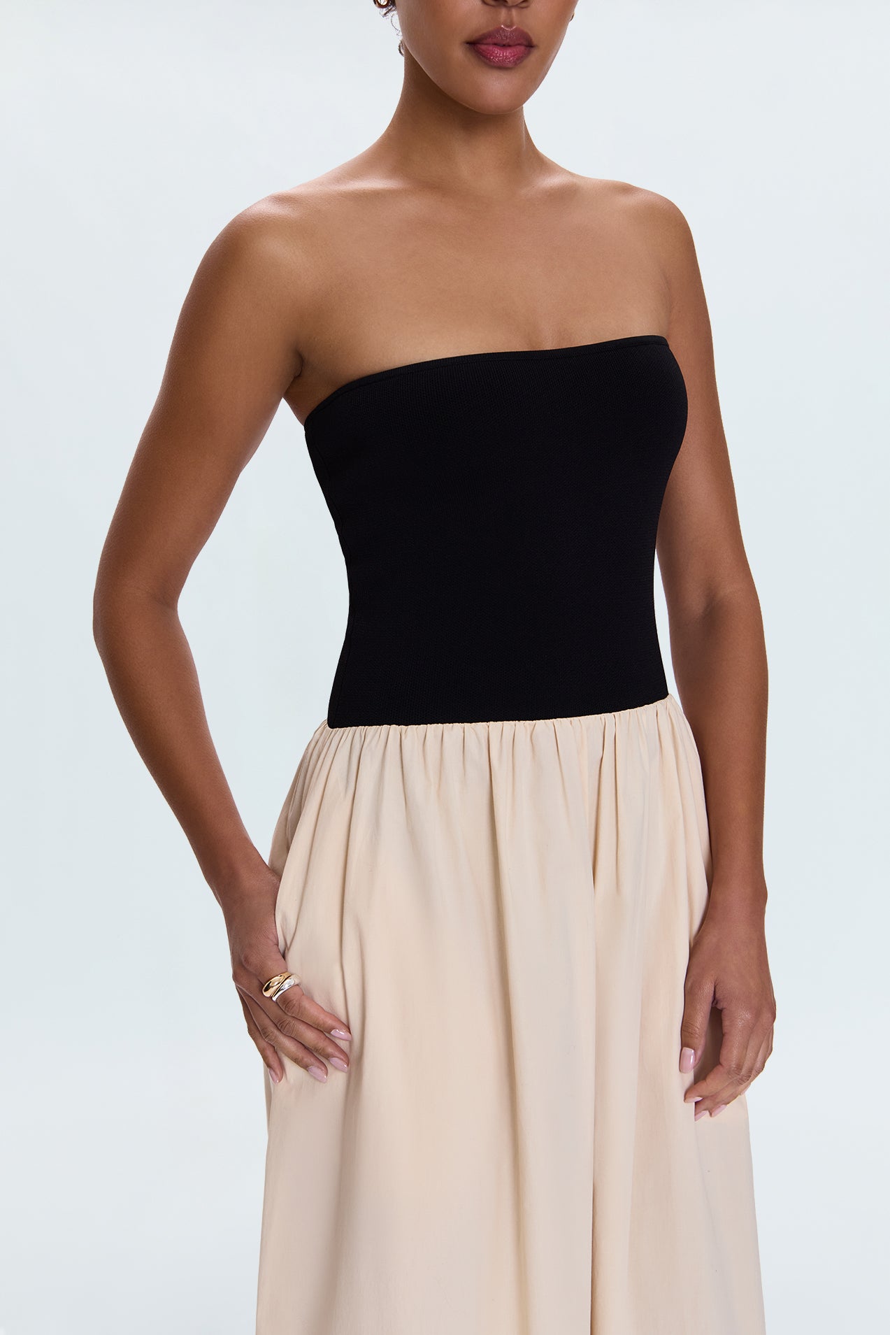 Our Mavo dress showcases a modern mix of knitted bustier at top and crisp, gathered cotton poplin skirt and is offered in a contemporary black and ecru colorway.