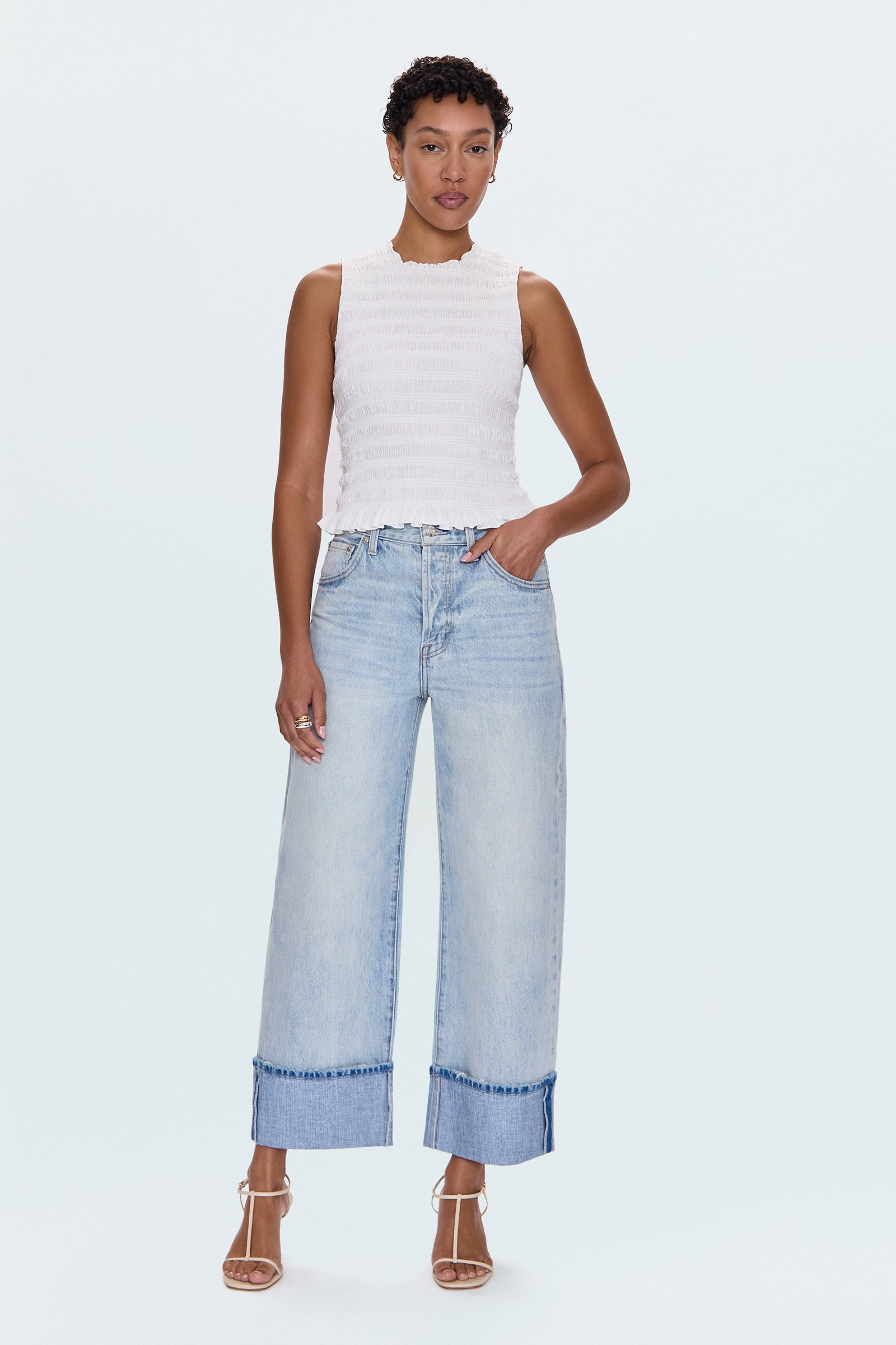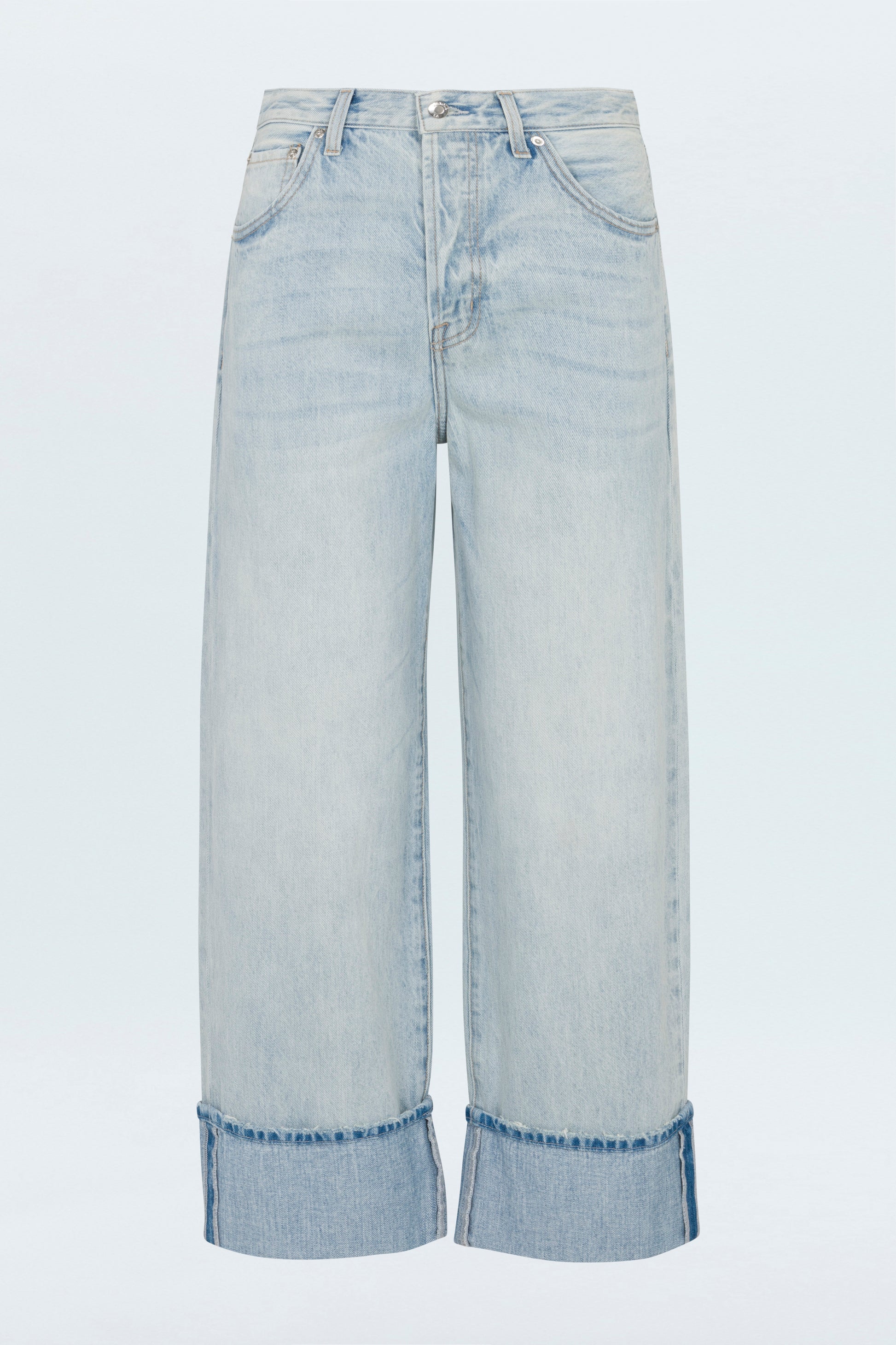 High-Rise Wide Leg Jeans in Sunrise. Meet your new favorite jeans. These high-rise jeans feature a relaxed, wide-leg fit, an oversized cuffed ankle hem, and are crafted from rigid, lightweight denim for a vintage-inspired look and feel. The Sunrise wash offers the perfect balance of light blue denim with vintage fading and whiskering.