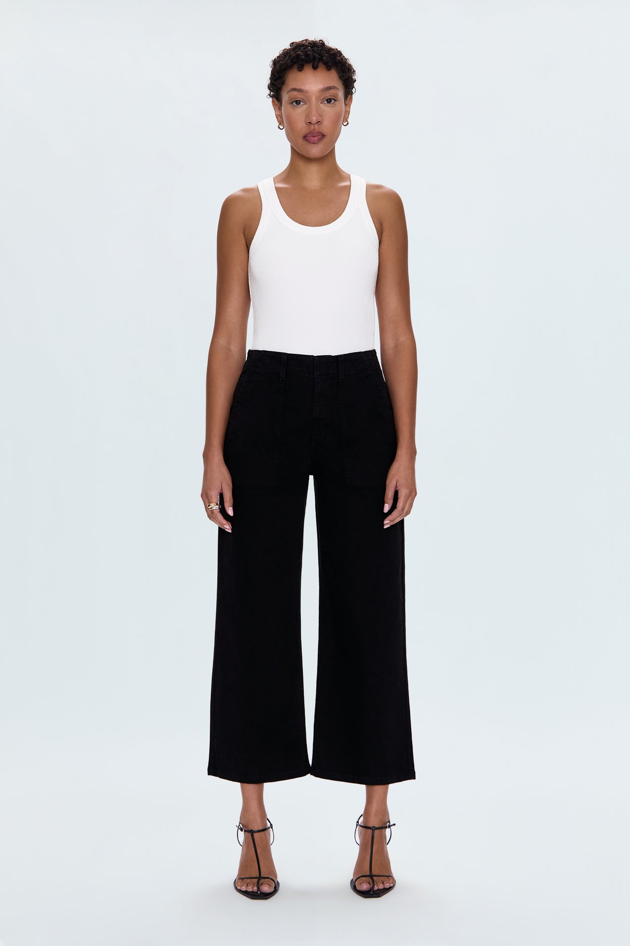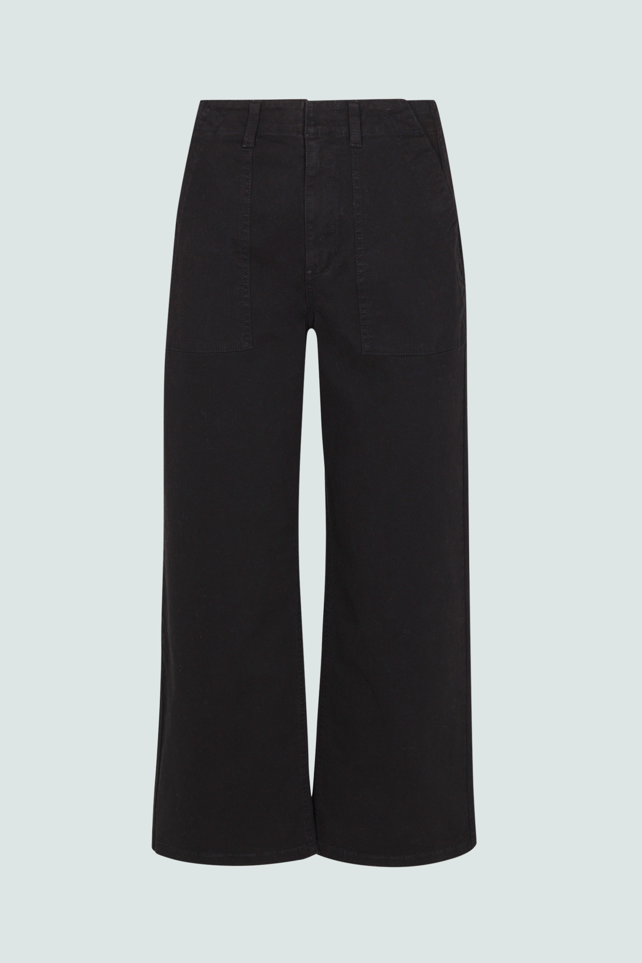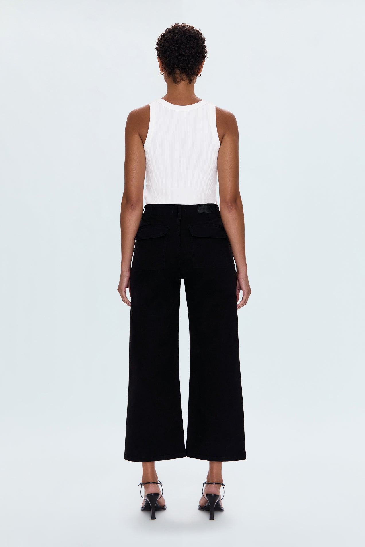 Relaxed, wide leg silhouette with a cropped, ankle length hem. Patch front pockets with seaming and button flap back pockets nod to utility design inspiration. Sophia is crafted from a comfort-driven trouser fabrication with stretch.