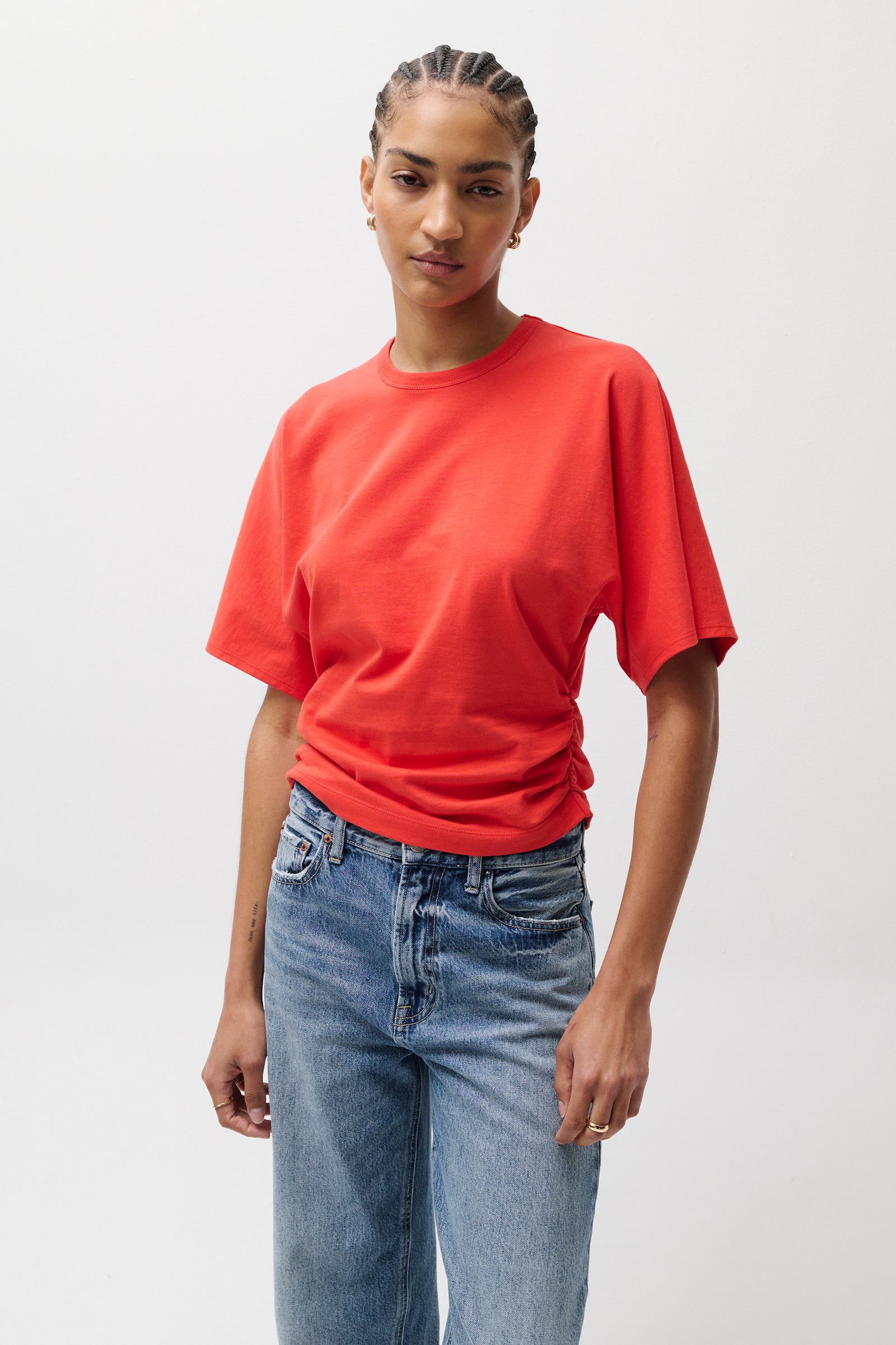 The perfect tee for the season, Veronica pairs a relaxed dolman fit and drop shoulders with subtle side cinching that cut a flattering silhouette. Cut from 100% cotton that holds its form while staying soft and breathable, the warm-weather staple is finished in Syrah, a bright poppy red that brings a vibrant pop to your every day.