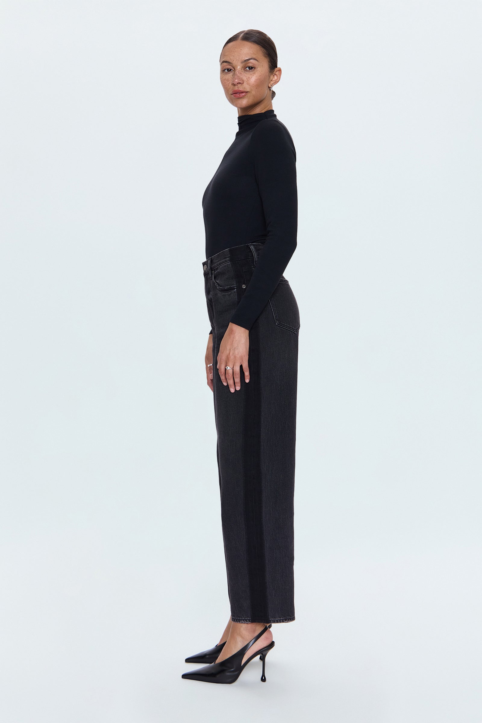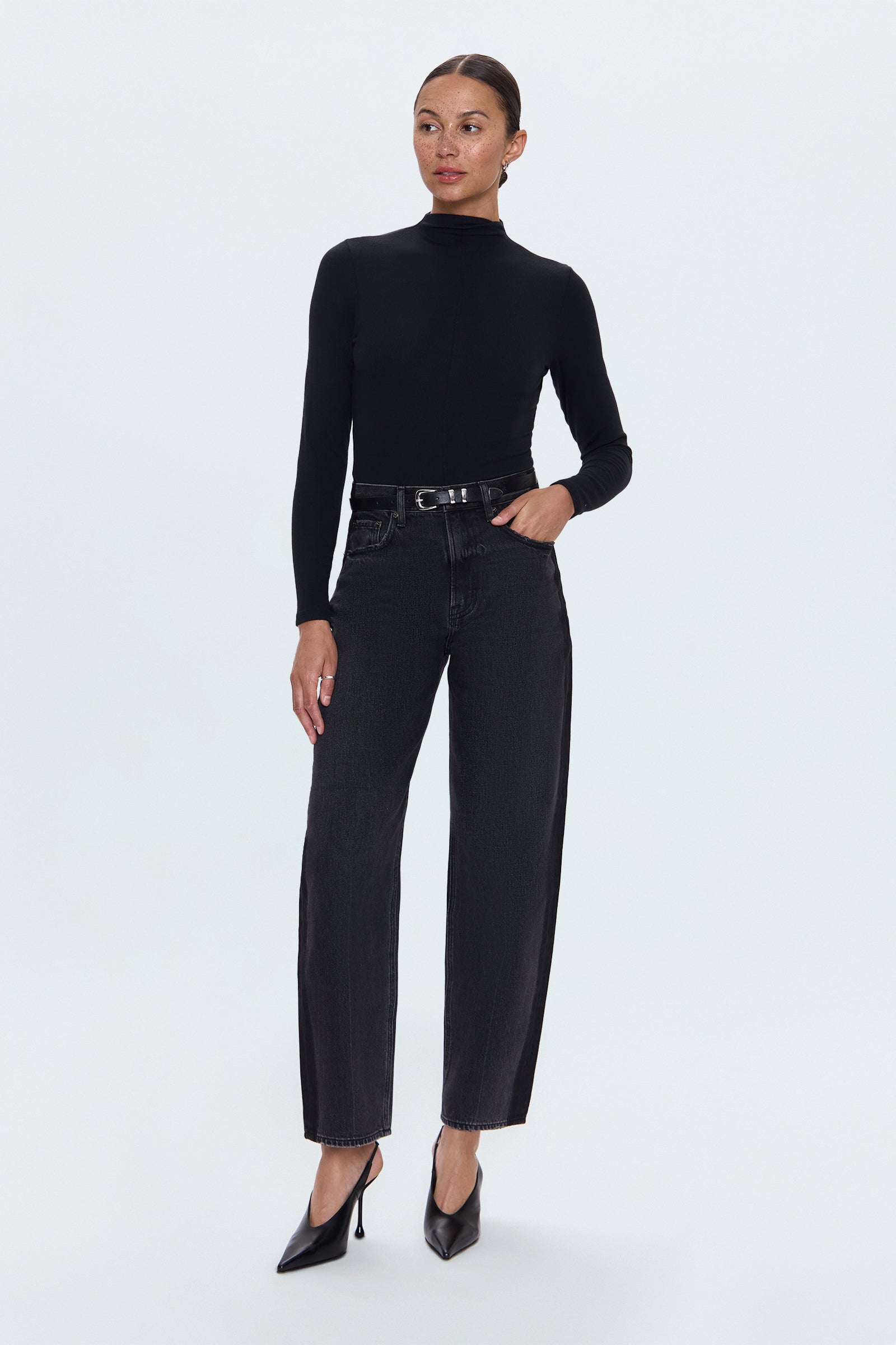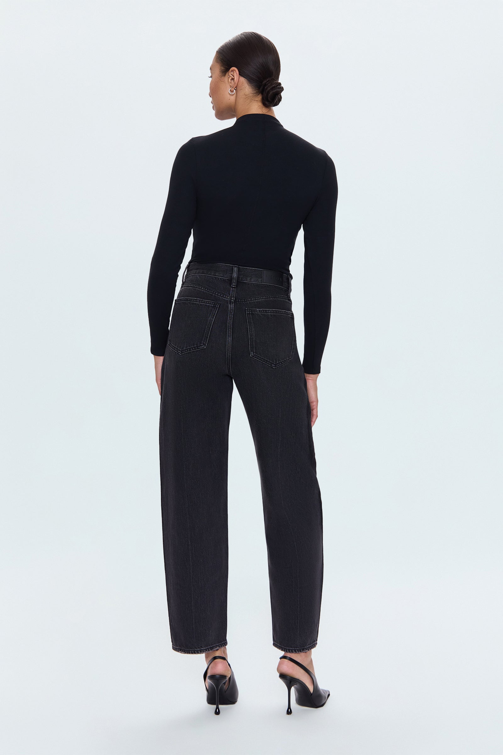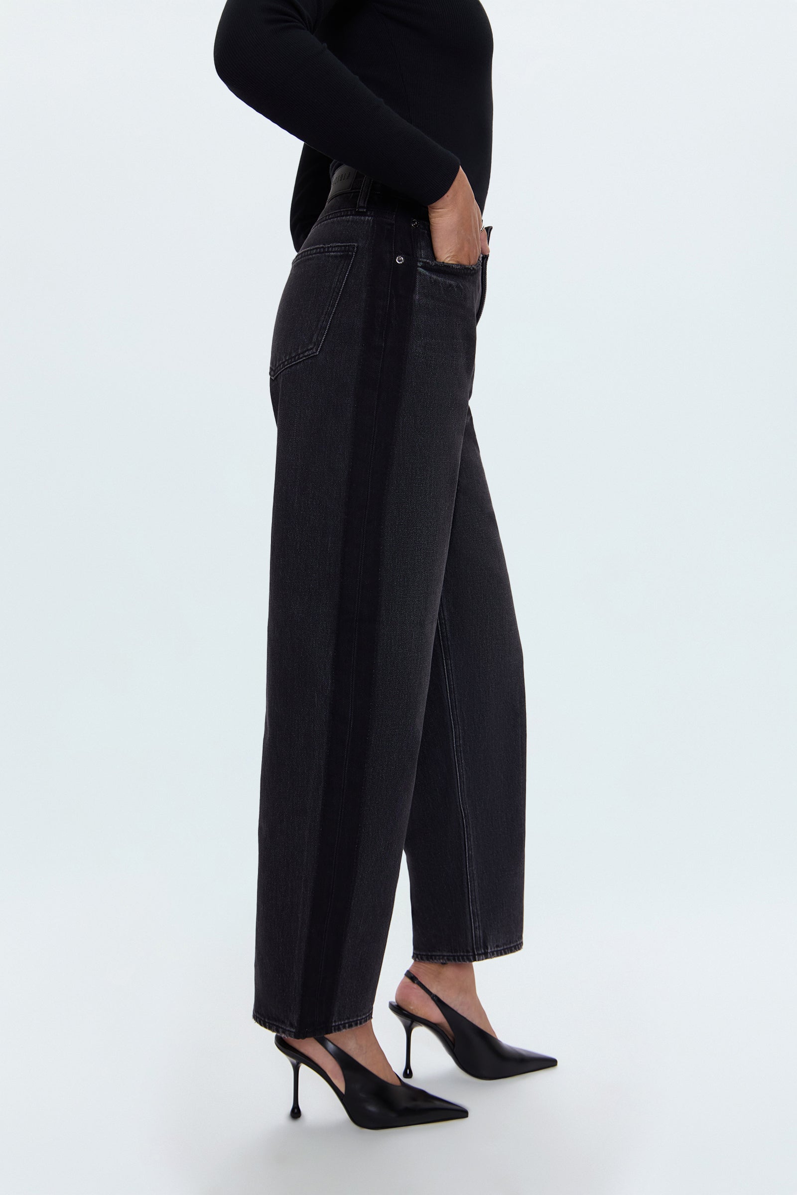 A best-selling silhouette, Wes offers a flattering high rise and full-length 30" inseam in a stylish barrel leg that delivers sophisticated drama. Clean hems and a tuxedo stripe detail refine the shape, while premium rigid non-stretch denim in Cinema, a rich black wash, adds effortless polish and versatility.
