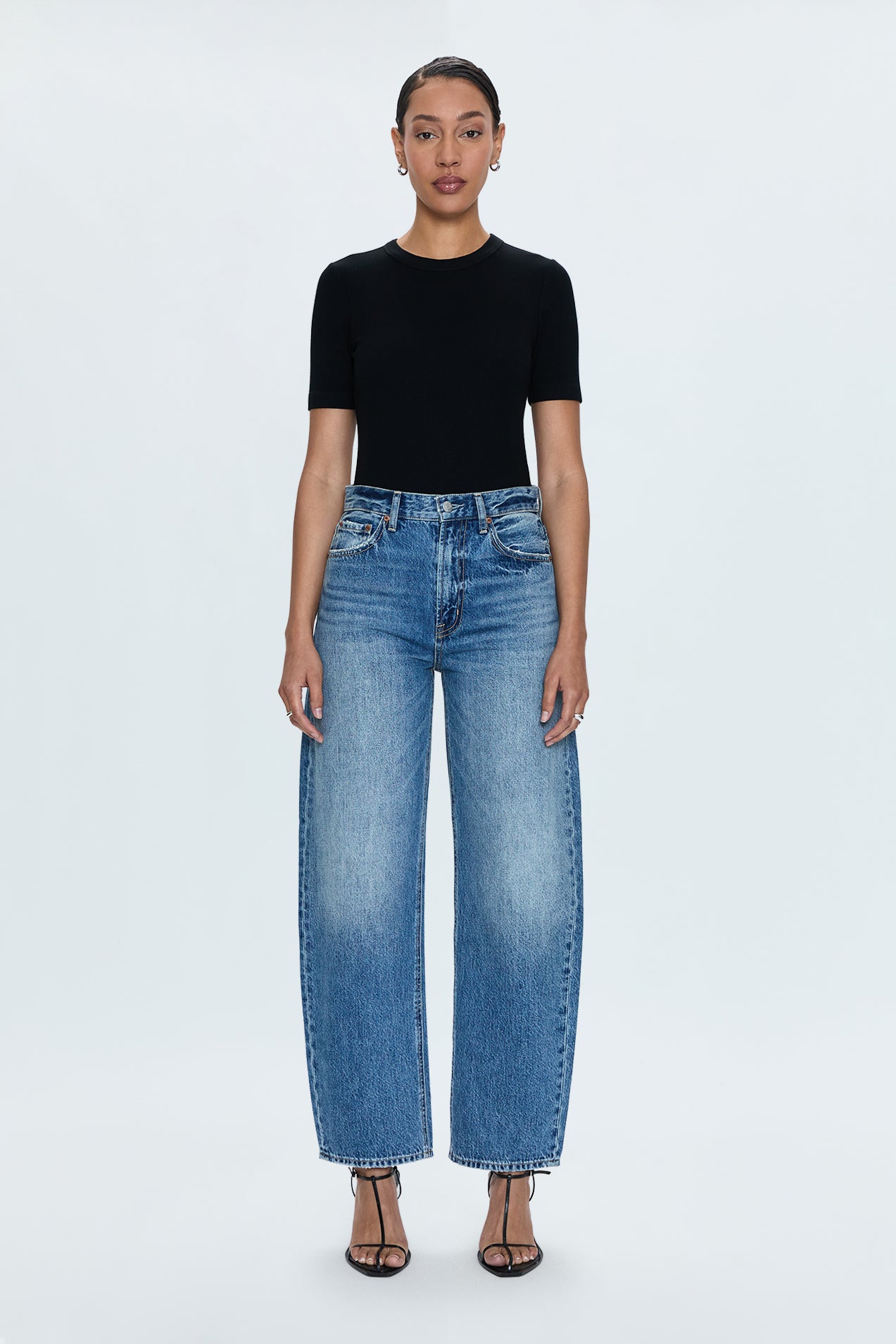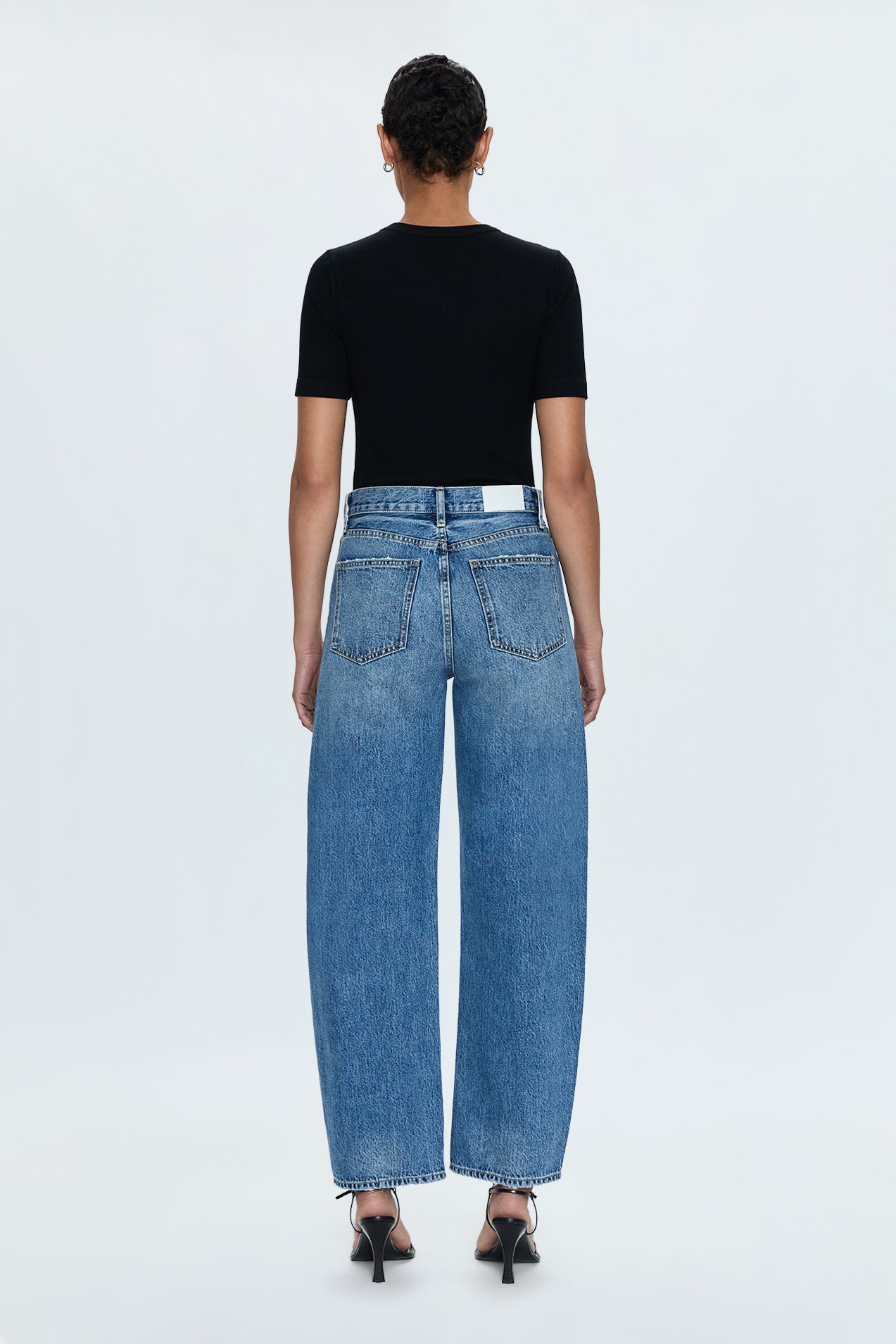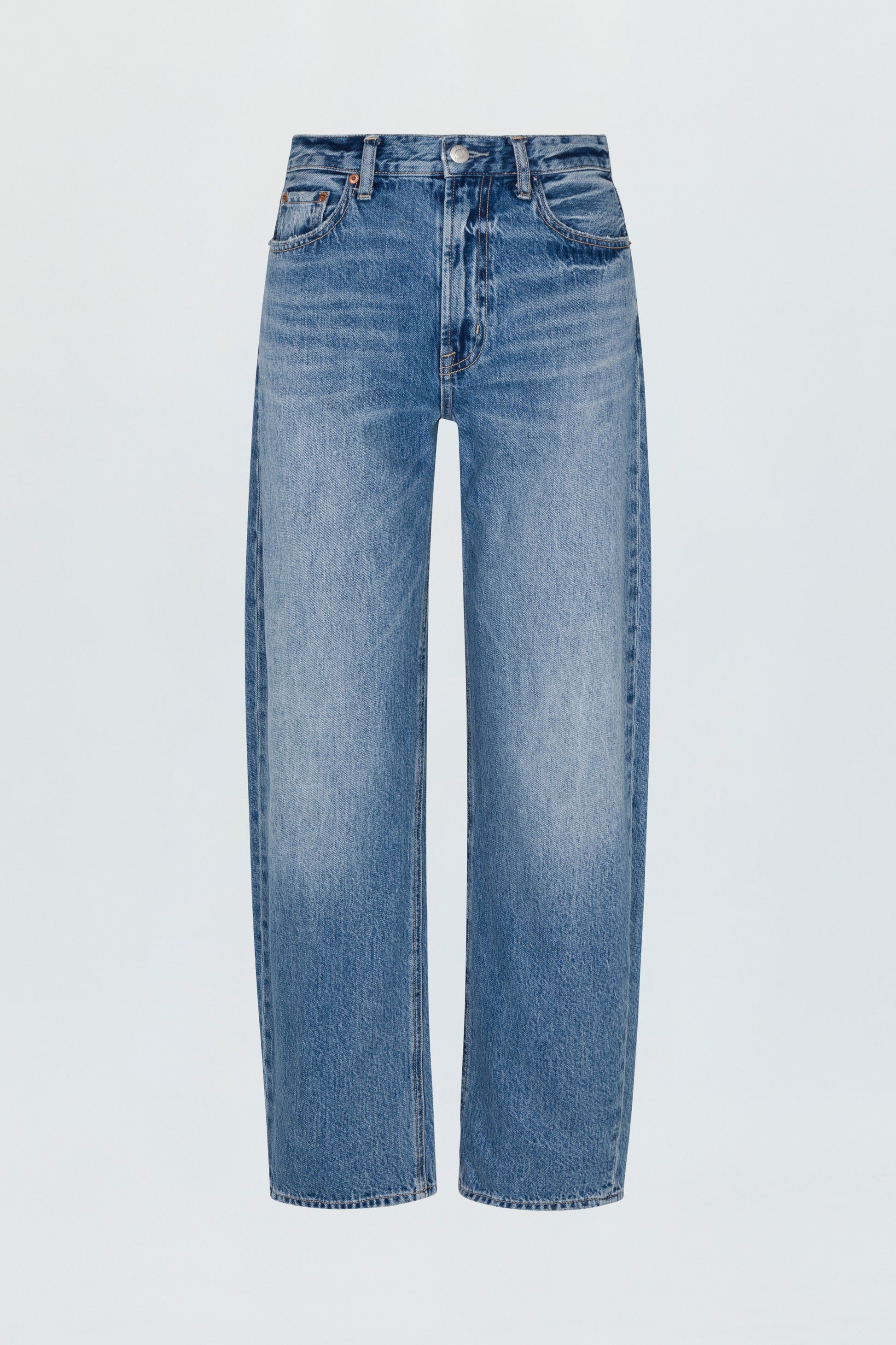 The best-selling jean that redefines modern denim. Wes sits at a flattering high rise with a stylish barrel leg silhouette and full-length 30" inseam that creates sophisticated drama. Clean hem finishes add polished detail to the contemporary silhouette. Crafted from our premium rigid non-stretch denim in Spectacle, a vintage-inspired medium blue wash with moderate fading and free of distressing for polished, lived-in perfection.